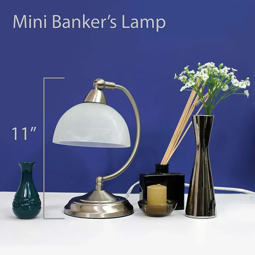 Elegant Designs Mini Modern Bankers Desk Lamp with Touch Dimmer Control Base Brushed Nickel.This modern mini banker''s lamp features a curved arm and touch control dimmer base with an exquisite finish. The marble glass shade finishes the look. A charming, inexpensive and practical desk lamp to meet your fashion lighting needs. Perfect lamp to complement your office decor.Elegant mini banker''s lampExquisite finish and marbleized glass shadeTouch Control Base with 4 settings (low,medium,high,off)Uses 1 x 40W Type G 16.5 candelabra base bulb (not included)Dimensions: L: 6.20" x W: 9" x H:13"UL/cUL listedBulb Type: IncandescentSwitch Type: Touch DimmerSwitch Location: BaseShade Diameter: 6"Shade Height/Slant: 4"Shade Security: Socket NutShade Material: GlassCord Color: ClearFinish/Color: Brushed NickelPrimary Material (Leather,Metal,Wood): MetalBase Type: E12Height from Base to Shade: 7"