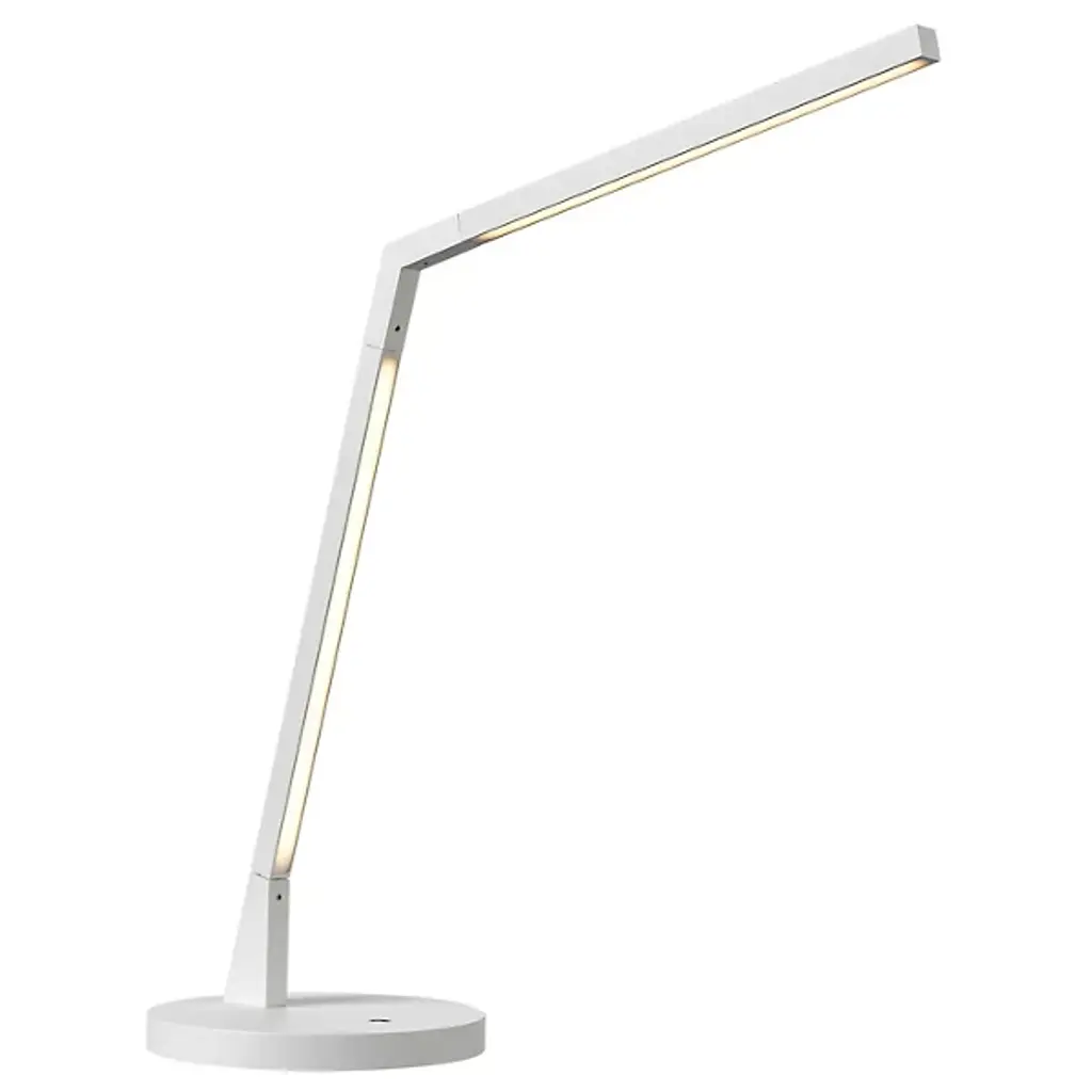 Ready for the task at hand, the Miter LED Desk Lamp from Kuzco Lighting is an elegant and minimalist task light for modern homes desiring a thinner, simpler appeal from their lighting fixtures. A flat circular base gives way to a stem that sharply-angles into two segments, each segment lined with a sharp, energy-efficient LED. The pair of linear lights provide a side and top glow, ensuring the work before it is fully illuminated.
