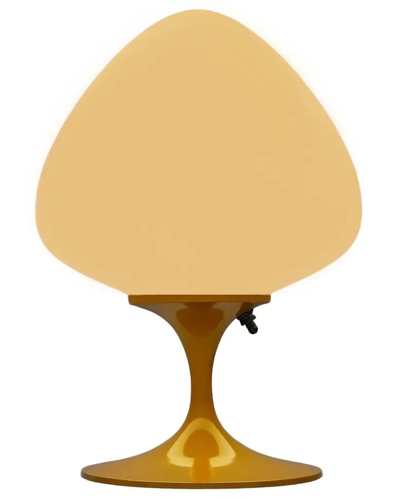 A gorgeous tulip form table lamp, desk lamp or bedside lamp. It features a glossy mustard yellow cast aluminum base with mouth blown frosted white glass shade in an acorn form. It takes one standard bulb up to 100 watts.These retro lamps work with all mid-century modern furniture & decor. Such as classic vintage mcm, art deco, space age, post modern, retro kitsch and contemporary design. Imagine a pair of these lamps used as bedside lamps, on end tables in a living room, or a matching pair on top of a vintage credenza. These lamps will compliment modern furniture from iconic designers like Charles Eames, Eero Saarinen, Harry Bertoia, Paul McCobb, Adrian Pearsall, Verner Panton, Florence Knoll, Joe Columbo, Hans Wegner & Arne Jacobsen. Use a single lamp as an accent lamp on your favorite cabinet or buy one as a funky desk lamp. These are sure to go with modern furniture manufacturers from the past and present. Confidently mix these lamps that fit with brands like Herman Miller, Knoll, Fritz Hansen, Kartell, Artemide, Planner Group, Niels Moller, Maurice Villency, and Thayer Coggin. If you have any question, please don't hesitate to message us.