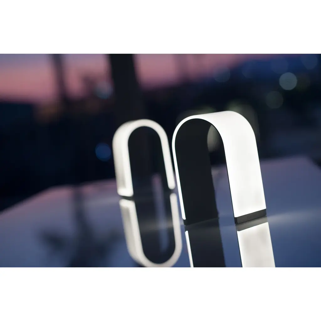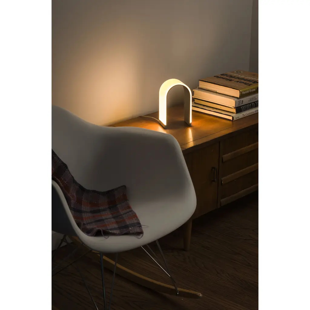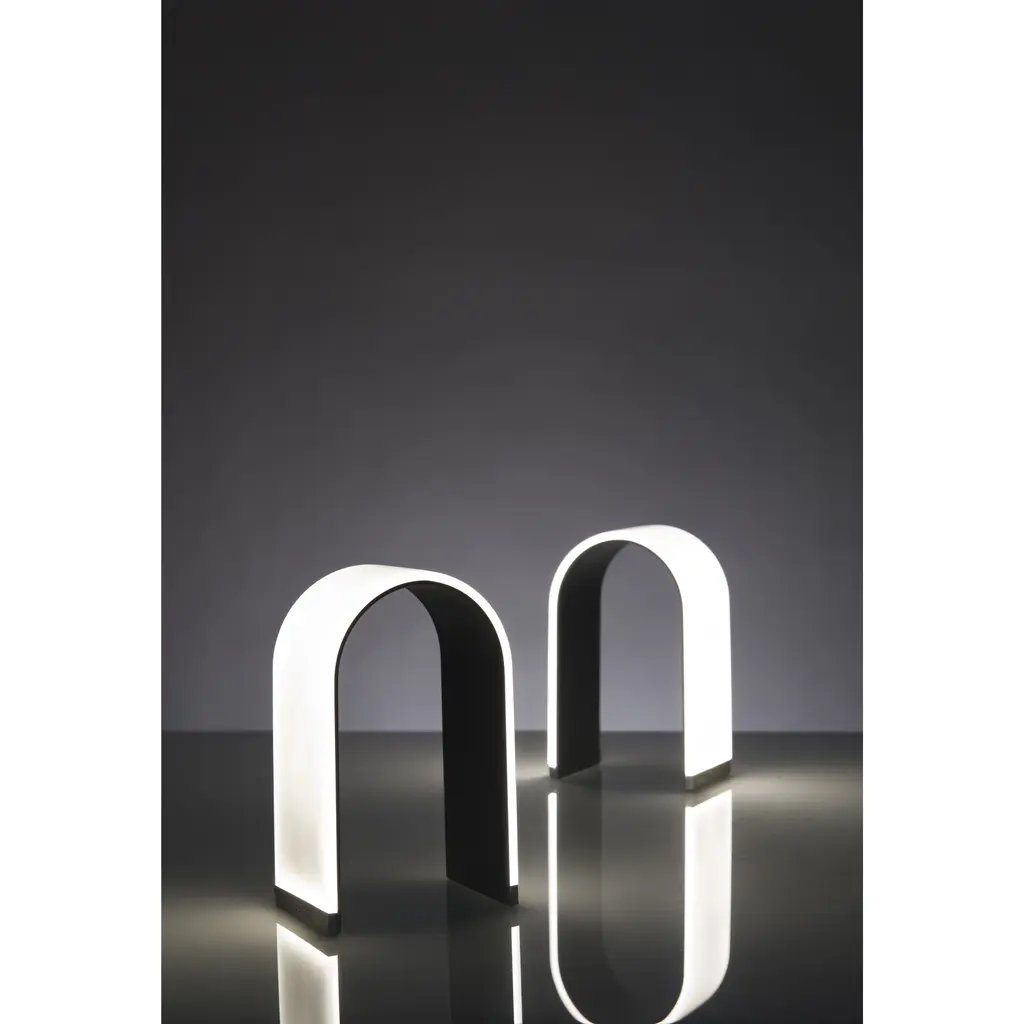 Meet Mr. n an arch-shaped LED table or accent lamp that features a unique, fashion forward, seamless design with an entirely glowing surface. The advanced light panel technology provides a soft, warm, omni-directional glow on the outside of the lamp. An