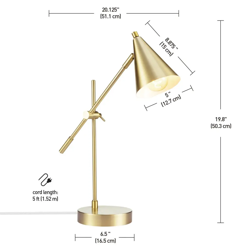 The Tacoma Desk Lamp from Novogratz x Globe Electric offers a task light in a clean tidy package with a trendy cone shape shade and a stylish matte brass finish. The adjustable brass balance arm and tilting lamp head lets you direct the light where you need it most while creating ideal lighting ambiance for any situation. The sculptural design adds a modern touch to your office, bedroom or living room and acts as the statement piece to tie your interior design together. Decorate with the Novogratz and Globe Electric - lighting made easy. Features
