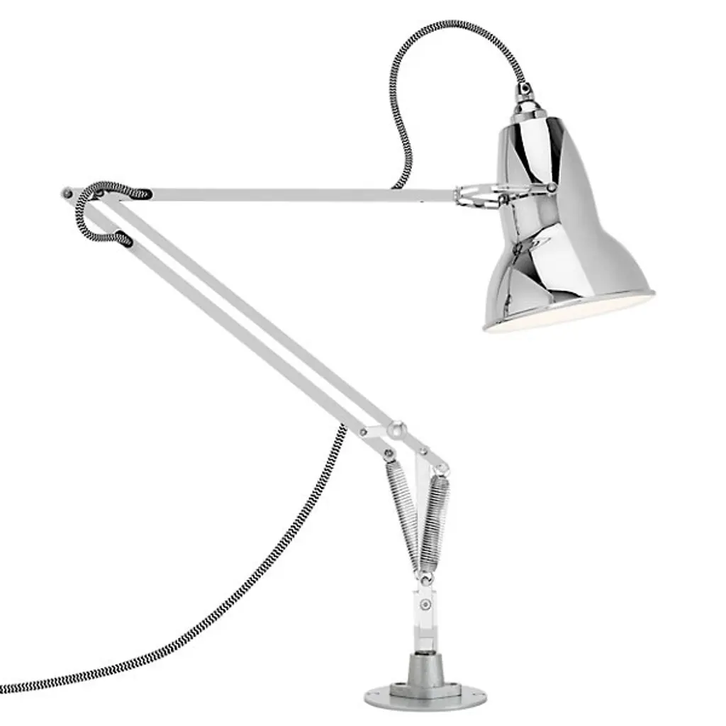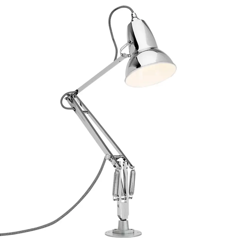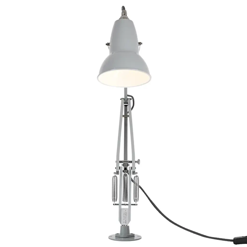 The Anglepoise Original 1227 Desk Lamp with Insert provides plenty of space-saving functionality, featuring a low-profile insert-mounting system, flexible joints, and an adjustable Aluminum shade. Its Constant Tension Spring technology allows for easy and sustainable customization, ensuring that the light is positioned exactly where you need it to be. Sleek metal detailing gives this piece a contemporary shine, including Aluminum arms, Chrome plate fittings, and a Cast Iron desk insert.