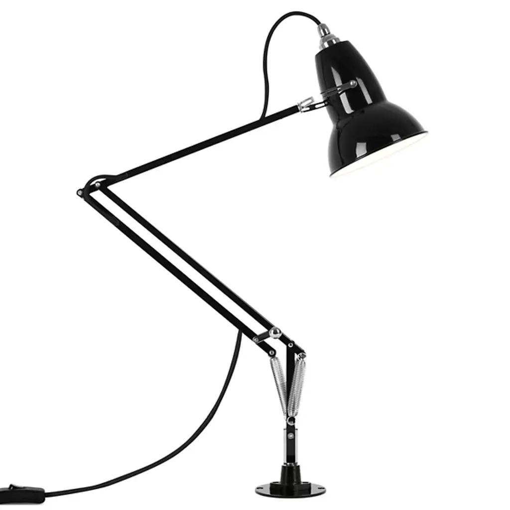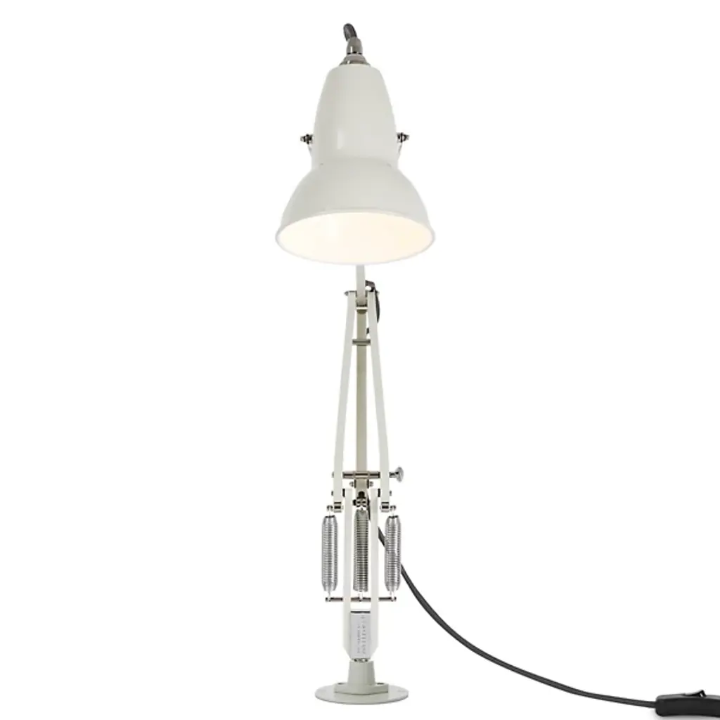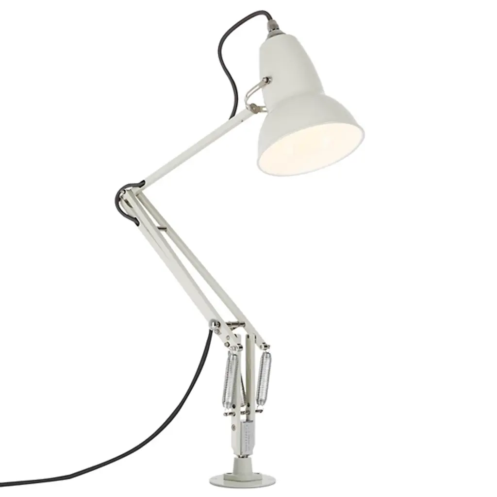 The Anglepoise Original 1227 Desk Lamp with Insert provides plenty of space-saving functionality, featuring a low-profile insert-mounting system, flexible joints, and an adjustable Aluminum shade. Its Constant Tension Spring technology allows for easy and sustainable customization, ensuring that the light is positioned exactly where you need it to be. Sleek metal detailing gives this piece a contemporary shine, including Aluminum arms, Chrome plate fittings, and a Cast Iron desk insert.