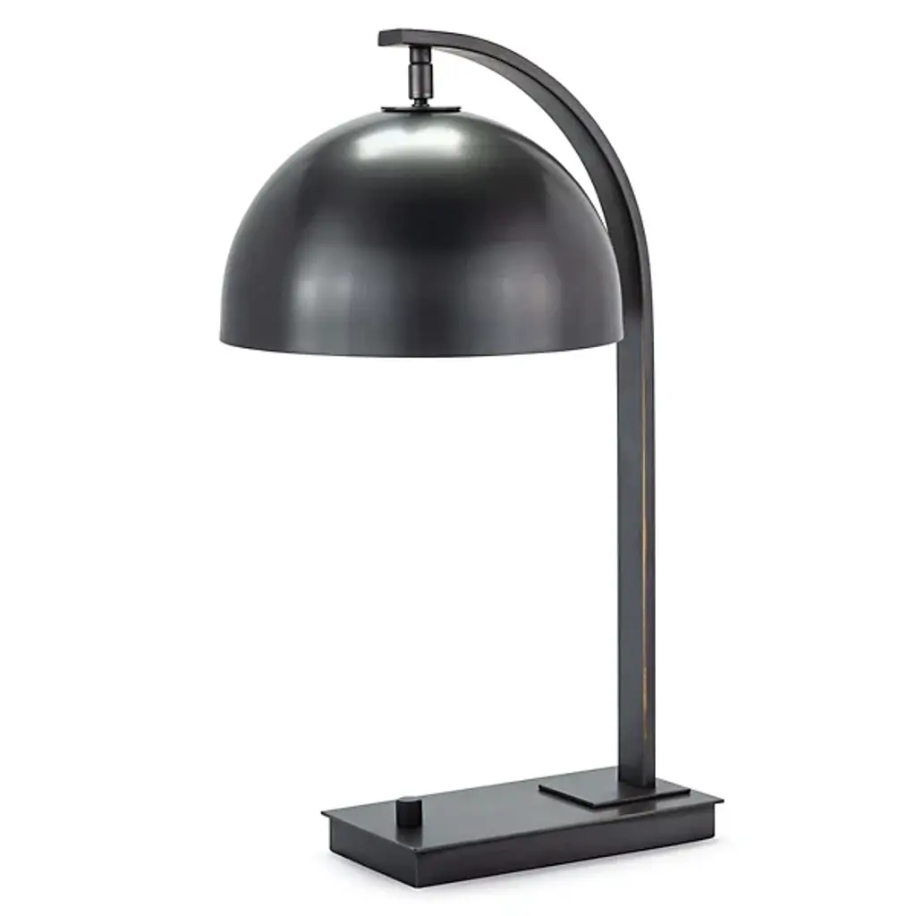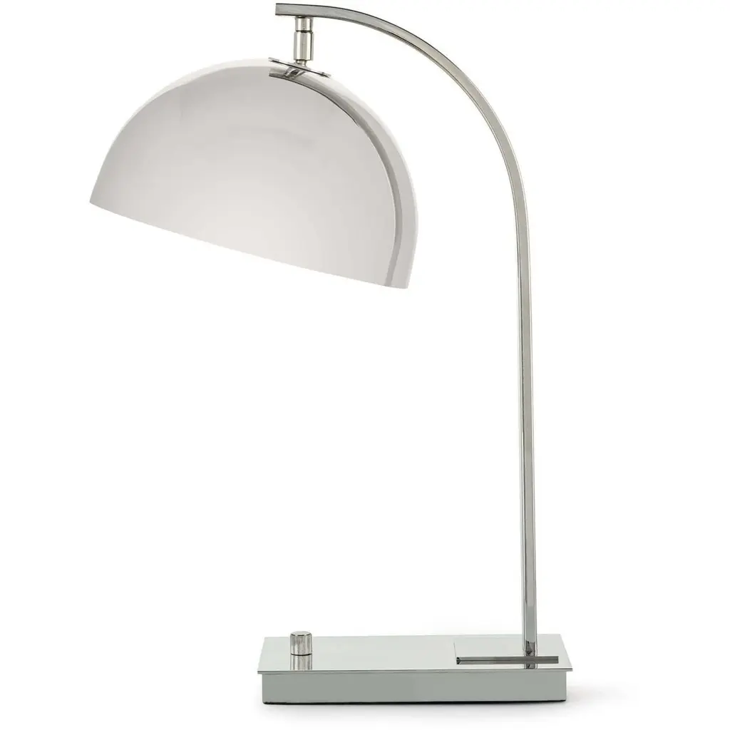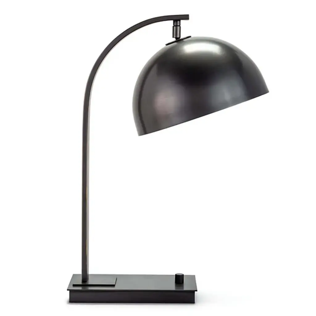 Get focused at your desk or simply create a pleasant ambiance with the dashing Otto Desk Lamp from Regina Andrew. The table lamp's clean composition of shapes makes it fitting with a range of home styles. It sits over the table with a low-profile rectangular base dotted with a satisfying on/off knob for easy functionality. The piece makes a visual statement as it stands with a generous curve. At the end of the curve, a swivel joint facilitates the easy adjustability of the lampshade. Made into a clean dome, the shade shields the eyes from any glare. Light fans out the shade's opening as a soft, smooth glow.