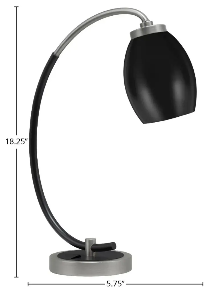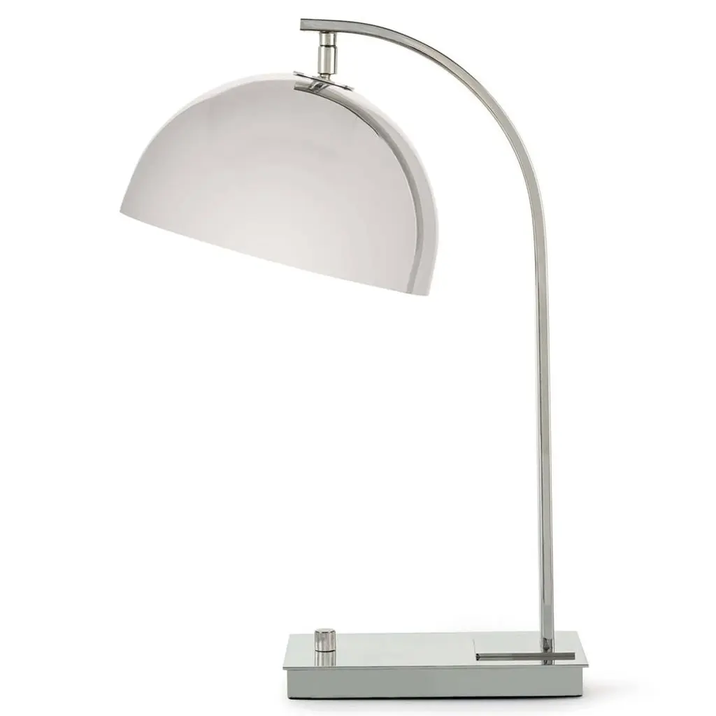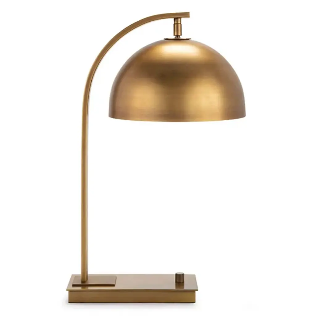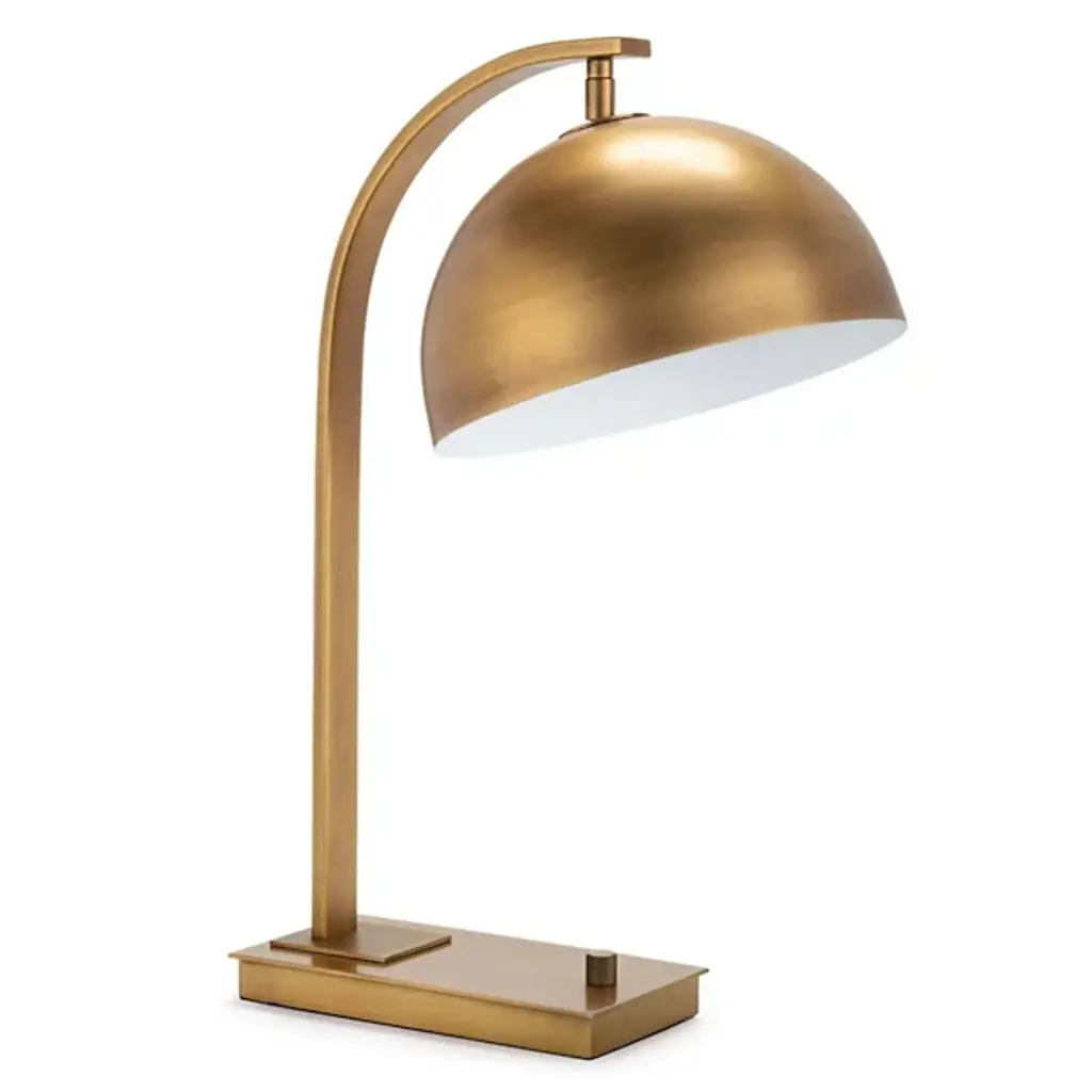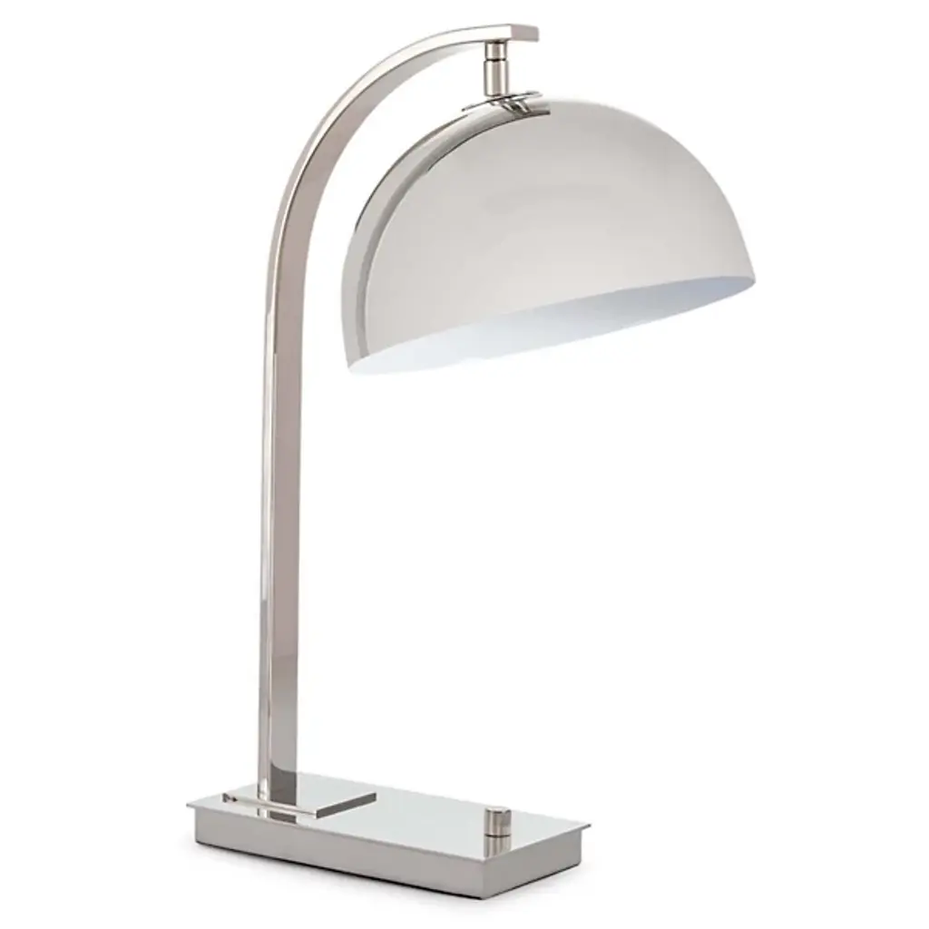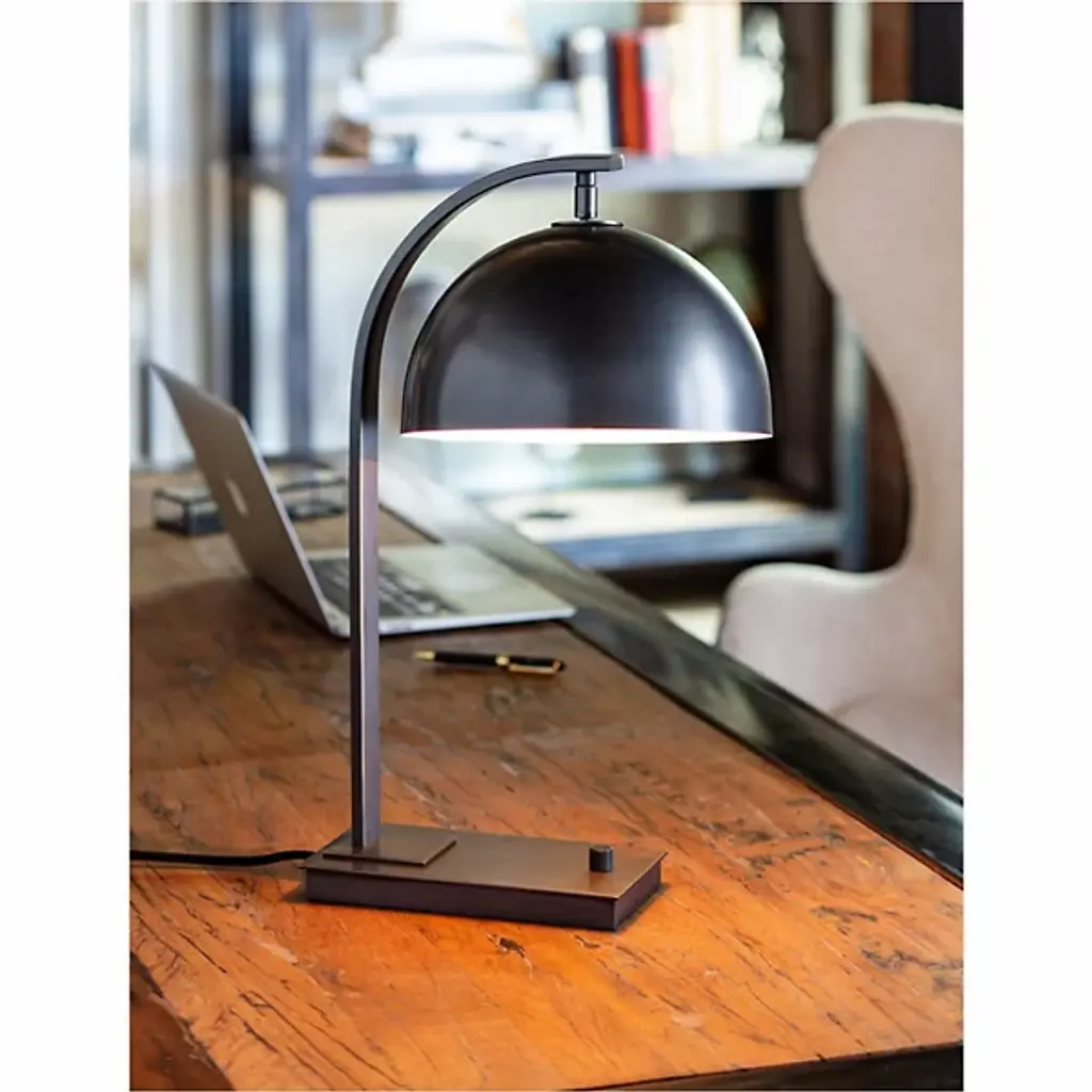 Get focused at your desk or simply create a pleasant ambiance with the dashing Otto Desk Lamp from Regina Andrew. The table lamp's clean composition of shapes makes it fitting with a range of home styles. It sits over the table with a low-profile rectangular base dotted with a satisfying on/off knob for easy functionality. The piece makes a visual statement as it stands with a generous curve. At the end of the curve, a swivel joint facilitates the easy adjustability of the lampshade. Made into a clean dome, the shade shields the eyes from any glare. Light fans out the shade's opening as a soft, smooth glow.