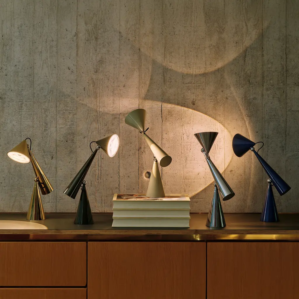 The Pose Task Light by Tom Dixon employs Fresnel lens technology, inspired by lighthouses, to produce a focused, magnified beam ideal for detailed tasks. Its conical design, available in Gold, Silver, Indigo, Putty, and Kelp, adds a distinctive touch to any workspace.