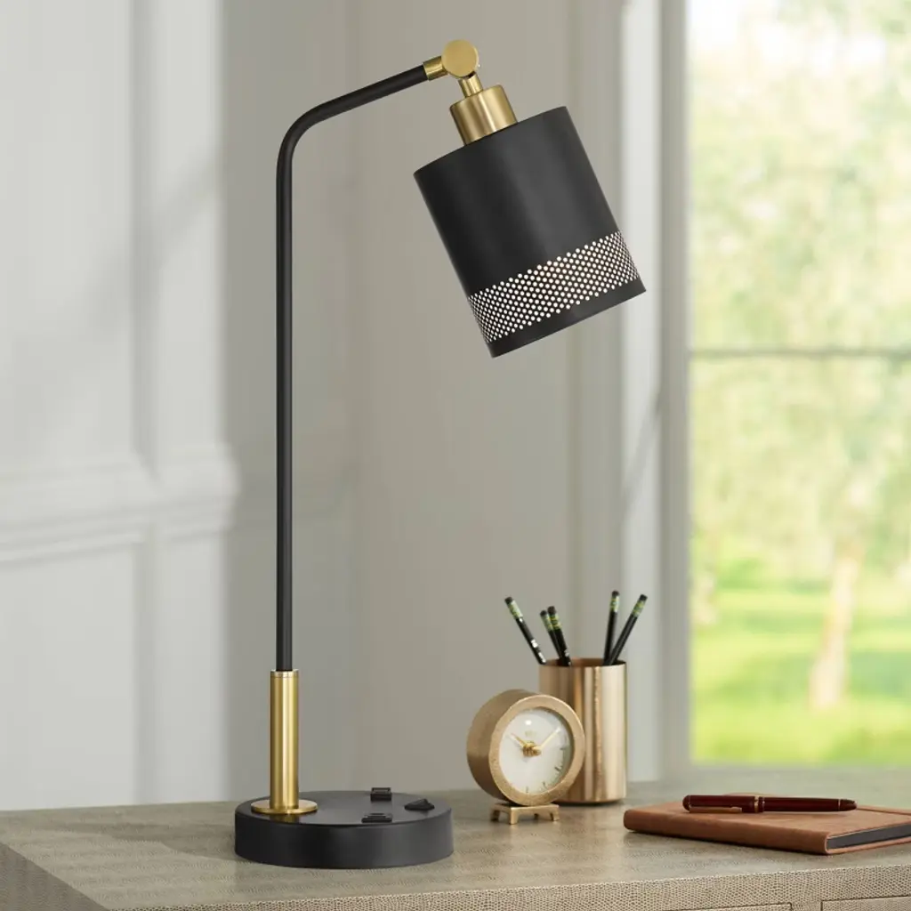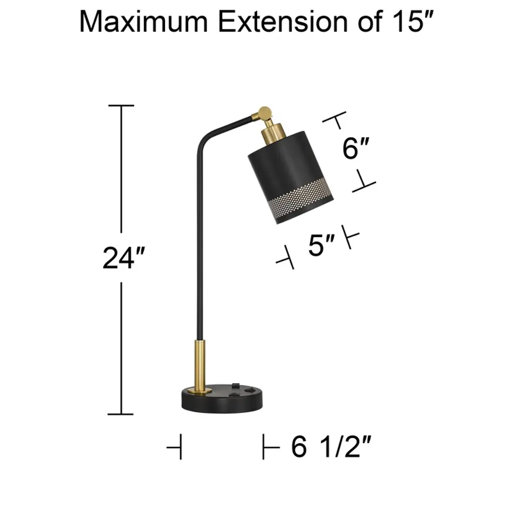 Possini Euro Design Keller 24" High Small Modern Desk Lamp Usb Port Ac Power Outlet Black Brass Finish Metal Single Home Office Living Room Charging