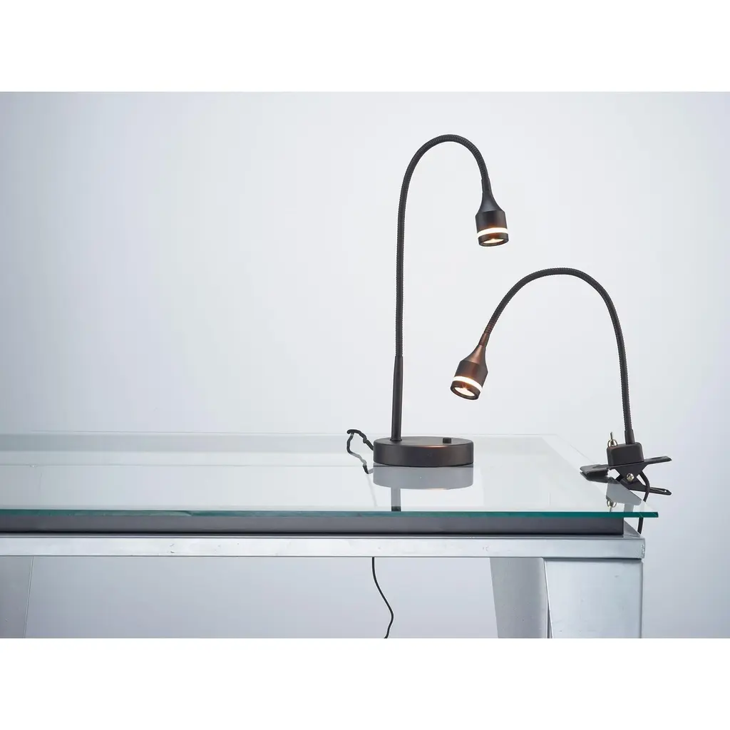 A take-off on our EOS collection, this 3 Watt LED clip lamp is made of metal with convex glass magnifier bulb shield. This lamp has a metal shade with a decorative light band accent, as well as a metal gooseneck for adjusting light height and direction. The shade measures 2" length and 1.25" diameter at lens. Rubber push switch on base. 15" gooseneck extends height from 11" to 18". Base: 4.75" diameter. CRI: 75; Color Temp: 4000K; 250 Lumens.