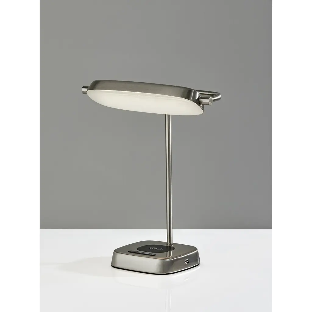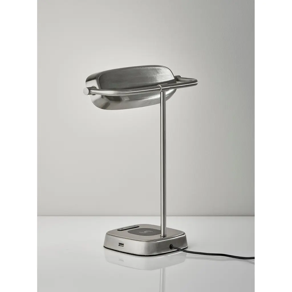 Modern functionality and mid-century modern styling meet in the Radley desk lamp. The lamp is anchored by a 6" black metal square base supporting a matching black metal stem leading to a rectangular shade. The shade houses an integrated, eco-friendly 8W LED light and a frosted diffuser for even lighting. With a touch smart switch conveniently located on the base, this lamp offers a full-range dimmer and five color temperature settings, making the perfect lighting available at the touch of a finger. For added functionality, the base of the lamp houses an integrated Qi-certified charging pad, supporting 5W charging on contact to get your phone from 0% to 100% in just 3-4 hours. A USB port is also located on the side of the base for charging a second device simultaneously. The lamp is powered by a 5' black cord to coordinate with the black metal finish. The Radley desk lamp is also available in an antique brass and brushed steel finish.