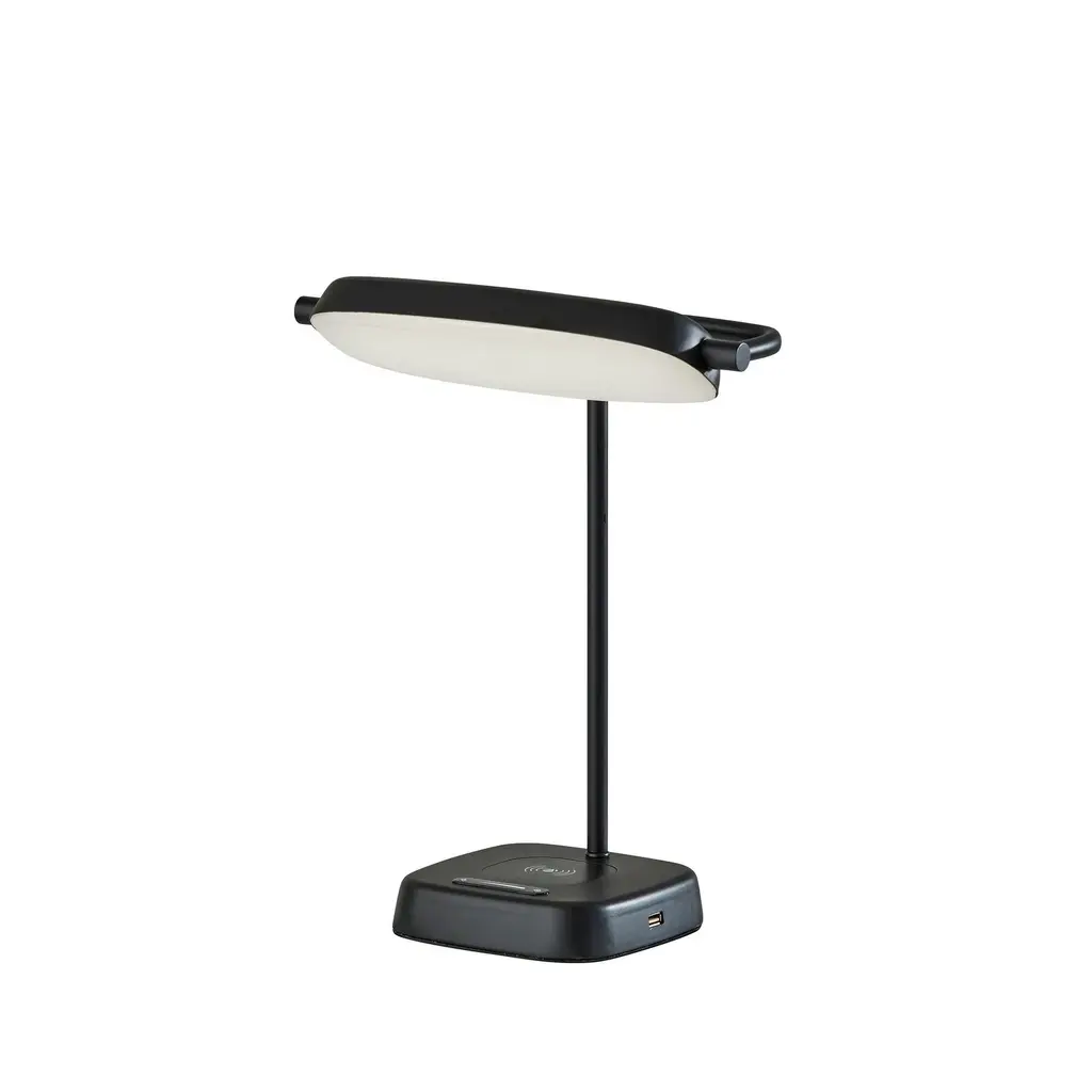 Modern functionality and mid-century modern styling meet in the Radley desk lamp. The lamp is anchored by a 6" black metal square base supporting a matching black metal stem leading to a rectangular shade. The shade houses an integrated, eco-friendly 8W LED light and a frosted diffuser for even lighting. With a touch smart switch conveniently located on the base, this lamp offers a full-range dimmer and five color temperature settings, making the perfect lighting available at the touch of a finger. For added functionality, the base of the lamp houses an integrated Qi-certified charging pad, supporting 5W charging on contact to get your phone from 0% to 100% in just 3-4 hours. A USB port is also located on the side of the base for charging a second device simultaneously. The lamp is powered by a 5' black cord to coordinate with the black metal finish. The Radley desk lamp is also available in an antique brass and brushed steel finish.
