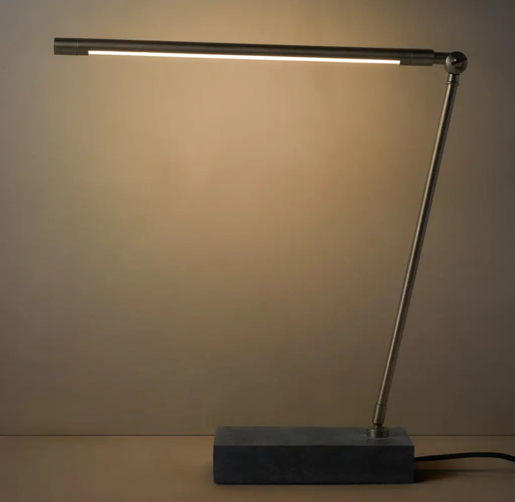 A solid marble base lends heft and substance to our sleek task lamp. The understated stone slab supports a slim metal stem with an articulating arm that pivots to perfectly illuminate every project.