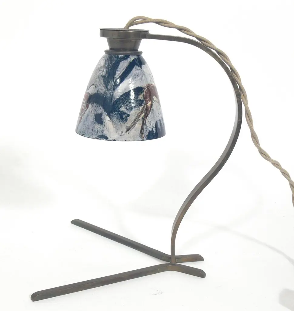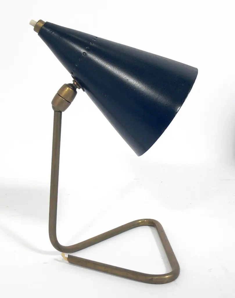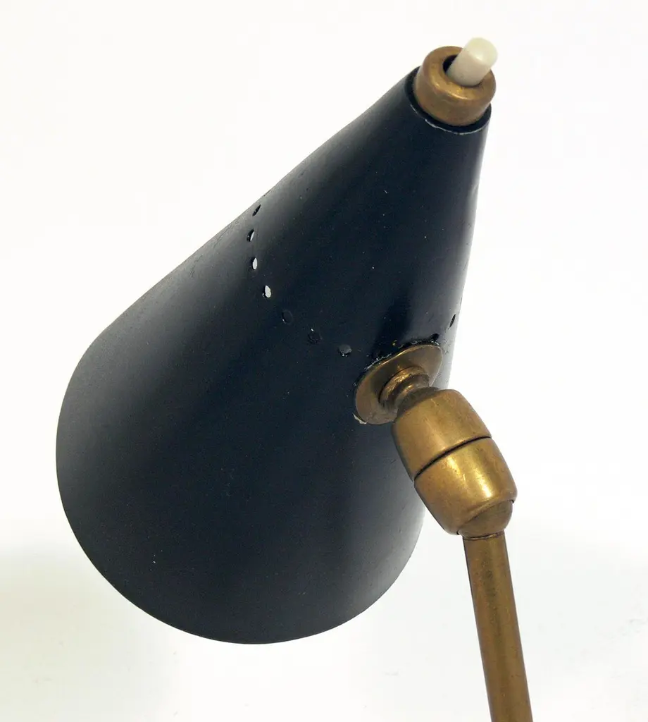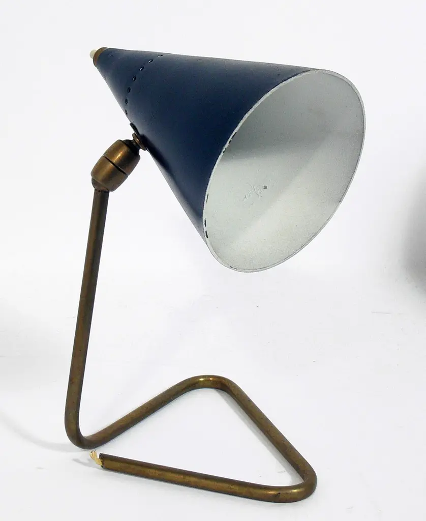 Selection of Petite French & Italian midcentury desk lamps, circa 1930s-1950s.From left to right, they are:1) Italian brass and enameled metal desk lamp, Italy, circa 1950s. It measures 10.5" H x 7.5" D.2) Italian brass and enameled metal desk lamp, Italy, circa 1950s. It measures 9.75" H x 6.5" W.3) French crystal orb lamp, in the manner of Jacques Adnet, France, circa 1930s. It measures 11.5" H x 5" W.They retain their warm original patina. They are rewired and ready to use. They are priced at $750 each.