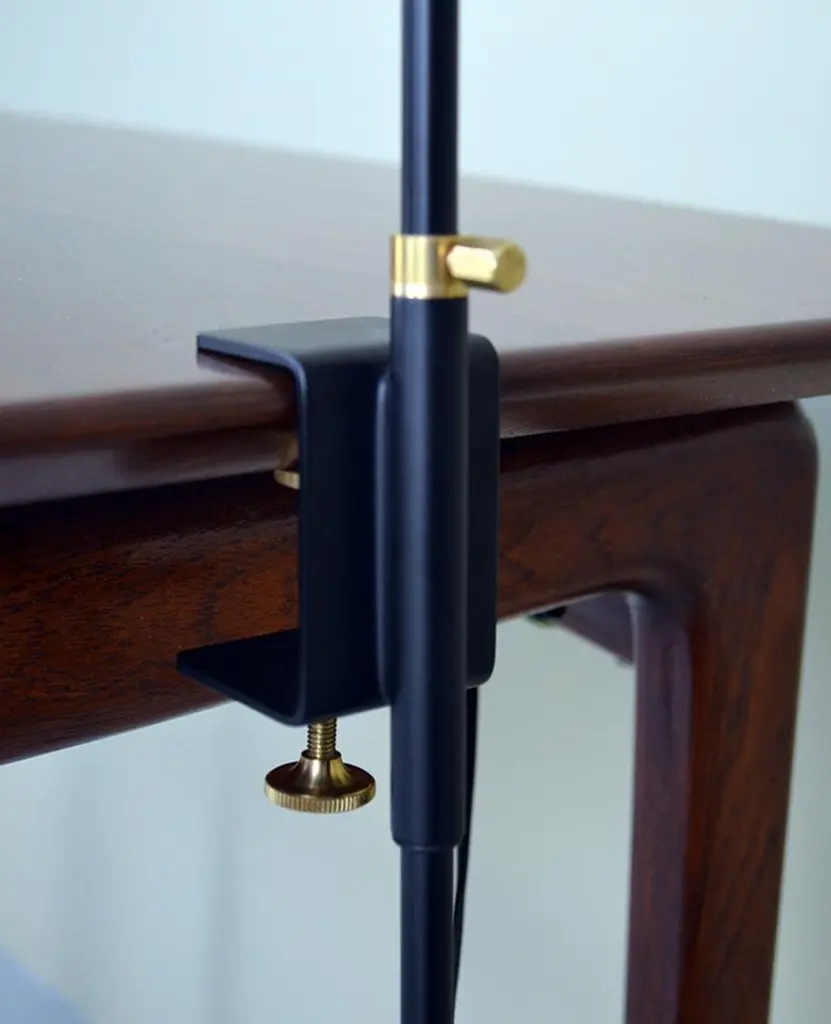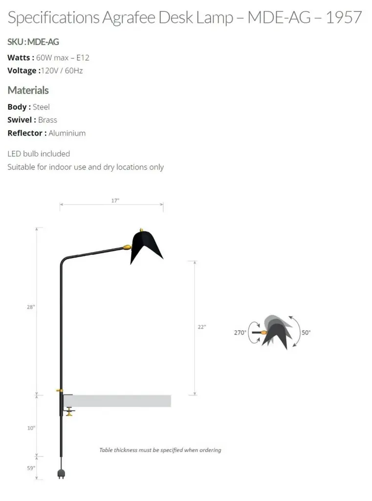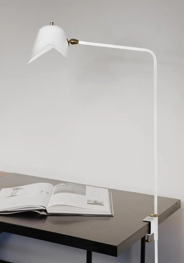 Clamp desk lamp. At 26 inches at its highest, this lamp may affix to many surfaces providing direct lighting where it is needed.Available in white or black. Brass swivels connect the shades.COLOR OPTIONAvailable in black or whiteFEATURES-CUSTOMIZATIONCustomization of the clamping system. Client must give the thickness of the desk or table where this lamp will be attached to.SWITCH OPTIONSThe agrafee with 1 swivel has the switch on cordWHAT SETS US APART? - Technical expertise - Full line of products - Availability - Customization - 5 year guarantee - Secured shipment - Small Repairs - After sale service - Experience (we introduced these lamps to the US, 22 years ago).WHAT TO LOOK OUT FOR:International shipping is expensive, lengthy and somewhat risky, potentially a stressful experience - Expensive: Most Mouille lamps are shipped in very large boxes. Shipping costs are calculated based on the volume of the box, Add this to Customs duties, insurance and US entry fee, and the final price will be approximately 25% more than your final net price. - Lengthy: Your lamp should be shipped by plane which takes about 8 to 9 hours flying from Europe to New York. Transportation is still deeply affected by the pandemic’s disruptions. - Damages: Individual boxes traveling next to heavier bundled goods typical of int’l shipping are more prone to damages. HOW WE DO IT:No need to go through all this, we’ve done this part. The lamps are sold from NY, ready to ship to you for your peace of mind. We thoroughly inspect them with our 44 check points before shipping, which gives us the confidence to offer a 5-year guarantee to our clients.
