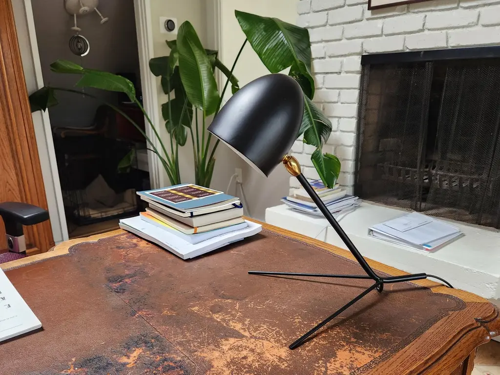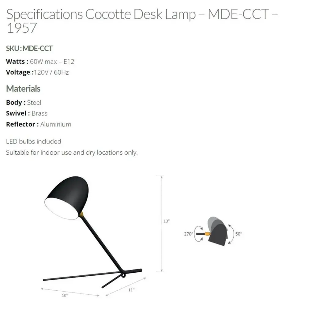 DESCRIPTION:This desk lamp is a certified re-edition, produced by the family of Serge Mouille on the site of his original workshop.An elegant triangular base supporting a slender, straight arm and cylindrical shade allows this deceivingly simple lamp to adapt well in any setting.COLOR OPTION:Available in Black or WhiteFEATURES:Shade rotates and swivelsSWITCH OPTIONS:The Cocotte desk lamp has the switch on electrical cordWHAT SETS US APART? - Technical expertise - Full line of products - Availability - Customization - 5 year guarantee - Secured shipment - Small Repairs - After sale service - Experience (we introduced these lamps to the US, 22 years ago).WHAT TO LOOK OUT FOR:International shipping is expensive, lengthy and somewhat risky, potentially a stressful experience - Expensive: Most Mouille lamps are shipped in very large boxes. Shipping costs are calculated based on the volume of the box, Add this to Customs duties, insurance and US entry fee, and the final price will be approximately 25% more than your final net price. - Lengthy: Your lamp should be shipped by plane which takes about 8 to 9 hours flying from Europe to New York. Transportation is still deeply affected by the pandemic’s disruptions. - Damages: Individual boxes traveling next to heavier bundled goods typical of int’l shipping are more prone to damages. HOW WE DO IT:No need to go through all this, we’ve done this part. The lamps are sold from NY, ready to ship to you for your peace of mind. We thoroughly inspect them with our 44 check points before shipping, which gives us the confidence to offer a 5-year guarantee to our clients.