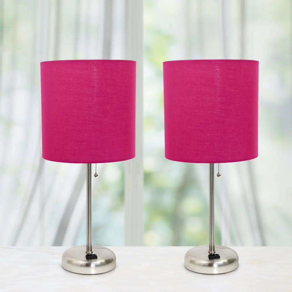 Simple Designs 19.5" 2 Pack Table Desk Lamp Set With Charging Outlet - 19.50 - Brushed Steel/pink Shade