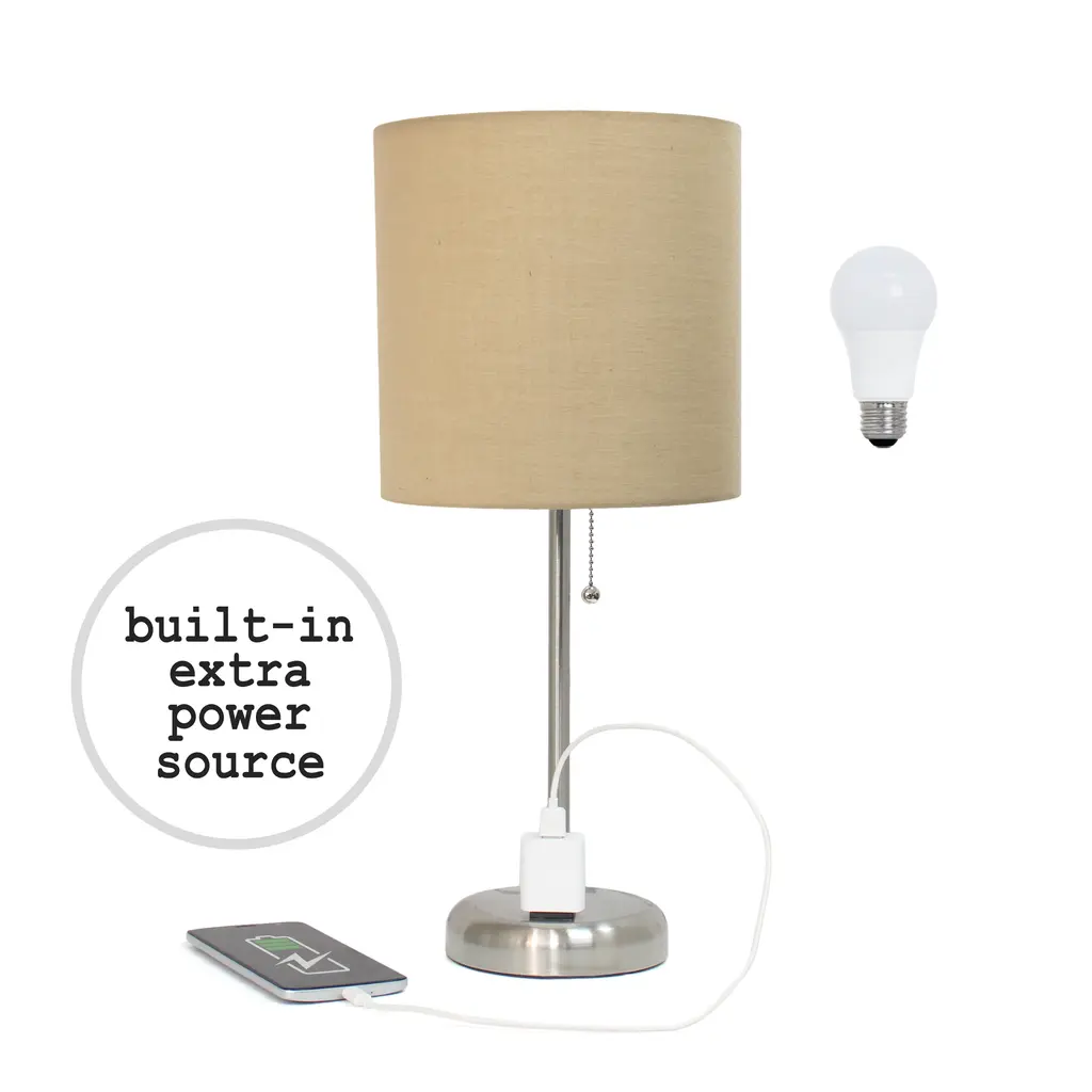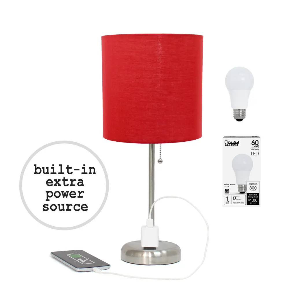 Simple Designs 9.5" Desk Lamp With Charging Outlet And Led Bulb Included - 19.50 - Brushed Steel/red Shade
