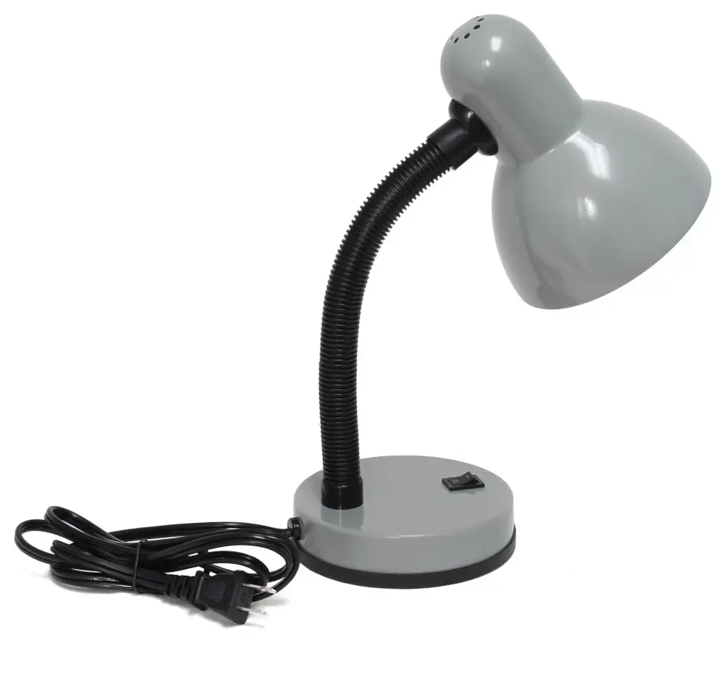 Simple Designs Basic Metal Desk Lamp with Flexible Hose NeckA nice, low-cost, and functional desk lamp to meet your basic lighting needs. This desk lamp features a painted metal base and shade, flexible hose neck, and ON/OFF switch located on the base for your convenience. Perfect for office, kids room, or college dorm!Bulb Type : Type A19 IncandescentSwitch Type : On/OffSwitch Location : BaseShade Diameter : 5"Shade Bottom Opening : 5"Shade Height/ Slant : 6Number of Lights : 1Maximum Wattage : 60Shade Material : MetalCord Length : 5''Finish/Color : SILVERPrimary Material : MetalMaterial Breakdown : Iron 90% Plastic 10%Base Type : E26 Medium BaseBase Dimensions : 4.75" diameter1.25" heightHeight from Base to Socket/Shade : 6"Bulb Included : NoETL CERTIFIEDPainted metal shade and baseFlexible hose neckON/OFF button switch located on base for convenienceDimensions: H: 13.85" Shade Diameter: 5"Perfect for office, kids room, or college dormUses 1x60W Type A Medium Base Bulb (not included)