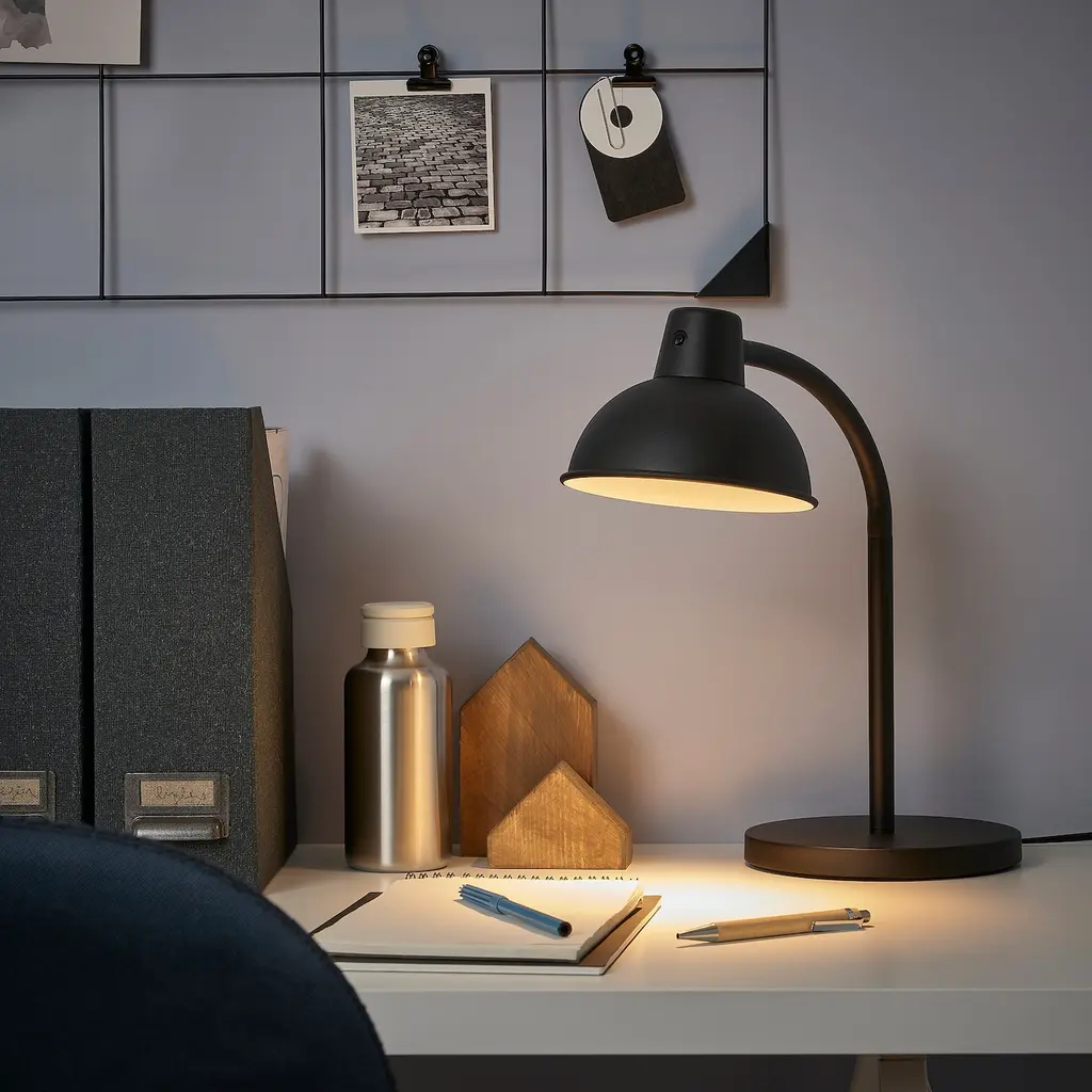 SKURUP Work lamp - black. Provides a directed light that is great for reading. You can easily direct the light where you want it because the lamp head is adjustable. Light bulb sold separately. IKEA recommends LED bulb E17 R14. May be completed with other lamps in the same series.