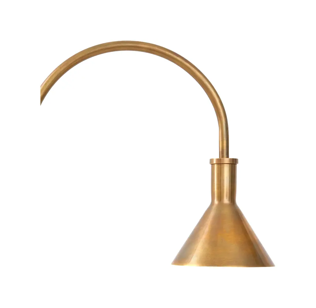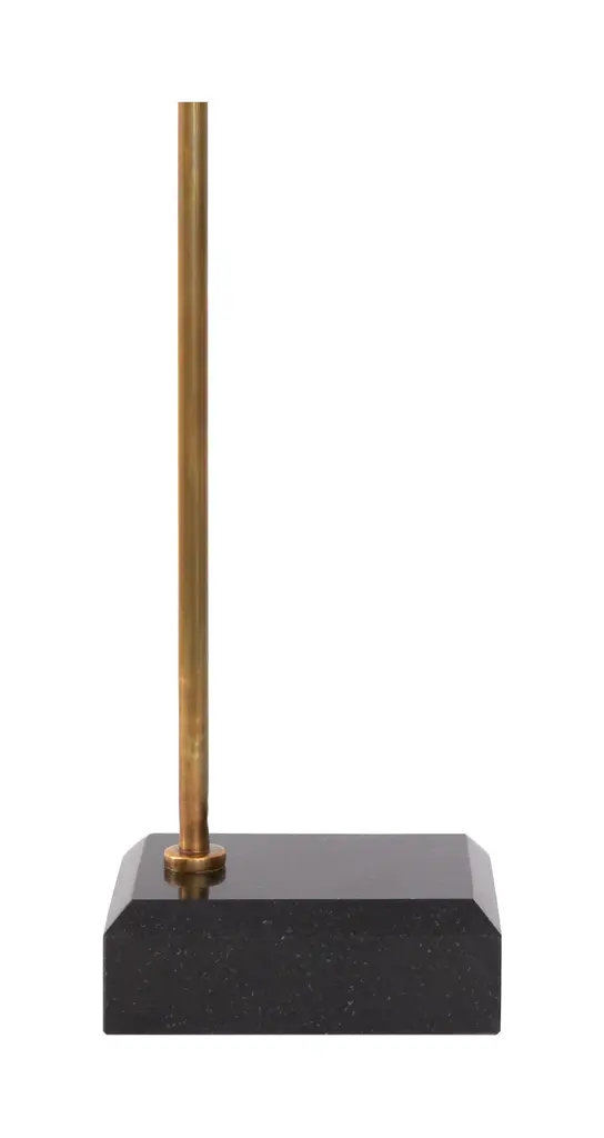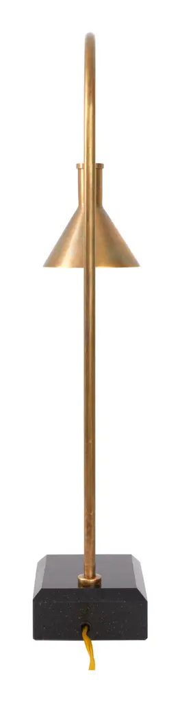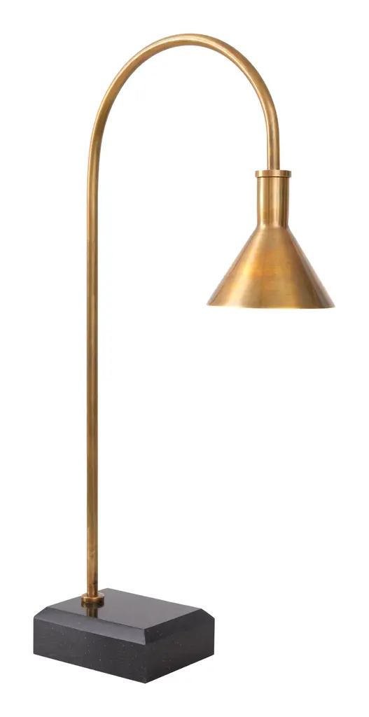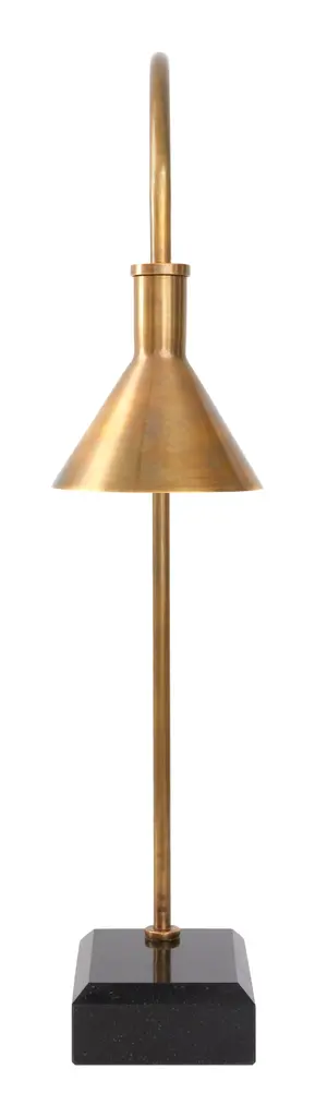 Brighten up your workspace with our vintage-inspired Sullivan Desk Lamp. Sleek and sophisticated in style, this classic task lamp is made up of a conical shade and an elegant arched arm, both of which are crafted from antiqued brass. We love the way this muted shine and fluid line play off of its weighty beveled black granite base. Perfection on the desktop in a chic home office, Sullivan would also be great as a pair on the nightstands in a timeless, minimalist bedroom. •antiqued brass•black granite •inline on/off switch•clear gold cord•requires 25W max/type G globe bulb Dimensions•4.75"W x 13.25"D x 25.5"H