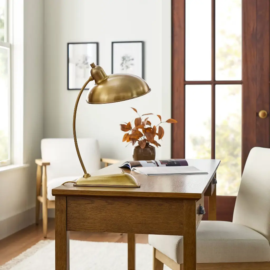 Decorate and illuminate your space with elegance using the Toggle Switch Brass Task Lamp from Hearth & Hand™ with Magnolia. This stunning task lamp features a bowl-shaped shade and a pedestal base, both joined by a brass rod. It's made with iron in a brass golden finish to complement your existing decor, and the on/off light setting with a base rocker switch allows for easy operation. Add this lamp to your home office or living room to study, work, or read in style.Hearth & Hand™ with Magnolia: Gather • Create • Enjoy