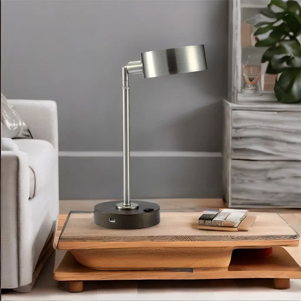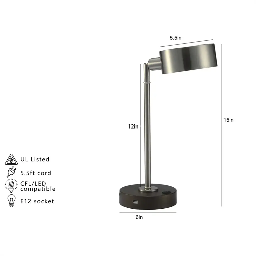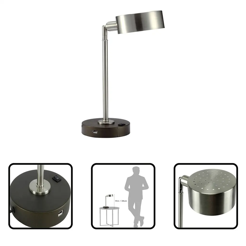 Details:This sleek desk lamp has a brushed silver finish that adds sophistication to any workspace or table.the lamp's modern, industrial design is the perfect addition to your bedroom, living room, or office. It provides bright and flicker-free LED lighting, perfect for reading or working.The adjustable lamp head lets you direct the light where you need it, reducing eye strain.Plus, it has a built-in USB port for convenient device charging, eliminating the need for extra adapters.Savor the extra perks provided by this stylish modern piece: a wireless charging pad for your phone and a handy USB charging port for a lovely old time.The Cambert LED Table Lamp is both practical and stylish, fitting seamlessly into any room decor.Upgrade your workspace with this functional and sleek lamp.Special Feature: USB port.USB port is placed near the On/Off Switch of the side of the bottom base of the Table Lamp.Accent your desk or night stand with this simple and energy-efficient LED desk lamp, this versatile desk lamp offers general illumination as well as task lightingAn On/Off black switch and a convenient USB port in the base is perfect for charging smart phones or other electronic devicesThe contemporary scheme and silver finish of this 1-light desk lamp will flawlessly bring a sensational look to the interior vibrancy of your dwellingWith a minimalistic style and long-lasting lighting, this brush silver accent desk lamp is perfect with a convenient adjustable neck moves up and down and rotates a full 360 degrees4 Watt LED E12 Bulb (360 Lumens, 2700 K) is INCLUDED. Bulb Option: 1 pc 40W MaxType B (E12) Incandescent Bulb , CFL compatible.▲Notice:1. All colors on our picture are for reference only, actual product colors may vary a little bit, due to different color settings of every screen device.2. Please note: most of our pruduct are hand-measured,therefore, the dimensions are for reference only, and may marginally deviate.3. If you have any questions about this product, please feel free to contact us. We will reply to you promptly.