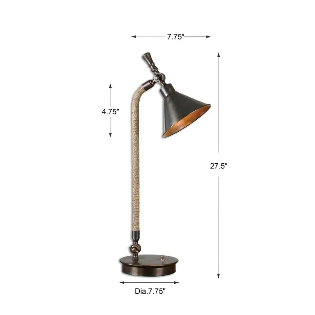 Bring a rugged yet refined touch to your workspace with the Duvall Desk Lamp, blending industrial materials with warm natural accents. The metal base is finished in a rich plated oxidized bronze that delivers timeless appeal, while a wrapped tea-stained rope detail around the neck introduces a subtle, tactile contrast. Designed with functionality in mind, both the base arm and the metal shade pivot up and down to direct light precisely where needed. Perfect for desks, nightstands, or side tables, this lamp is both a practical lighting solution and a statement piece in modern rustic or industrial interiors. Key Features: Oxidized bronze metal base for bold, industrial appeal Bulb Type: E26 (Standard); Wattage: 40WAdjustable arm and shade pivot for directional lightingBase switch for easy on/off controlDimensions: 28"H; Shade – 5"H x 7" Dia.Weight: 10 lbs A handsome fusion of bronze metal and earthy rope detailing, built for versatile illumination and modern style.