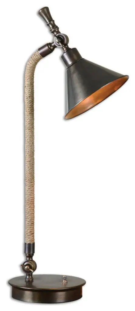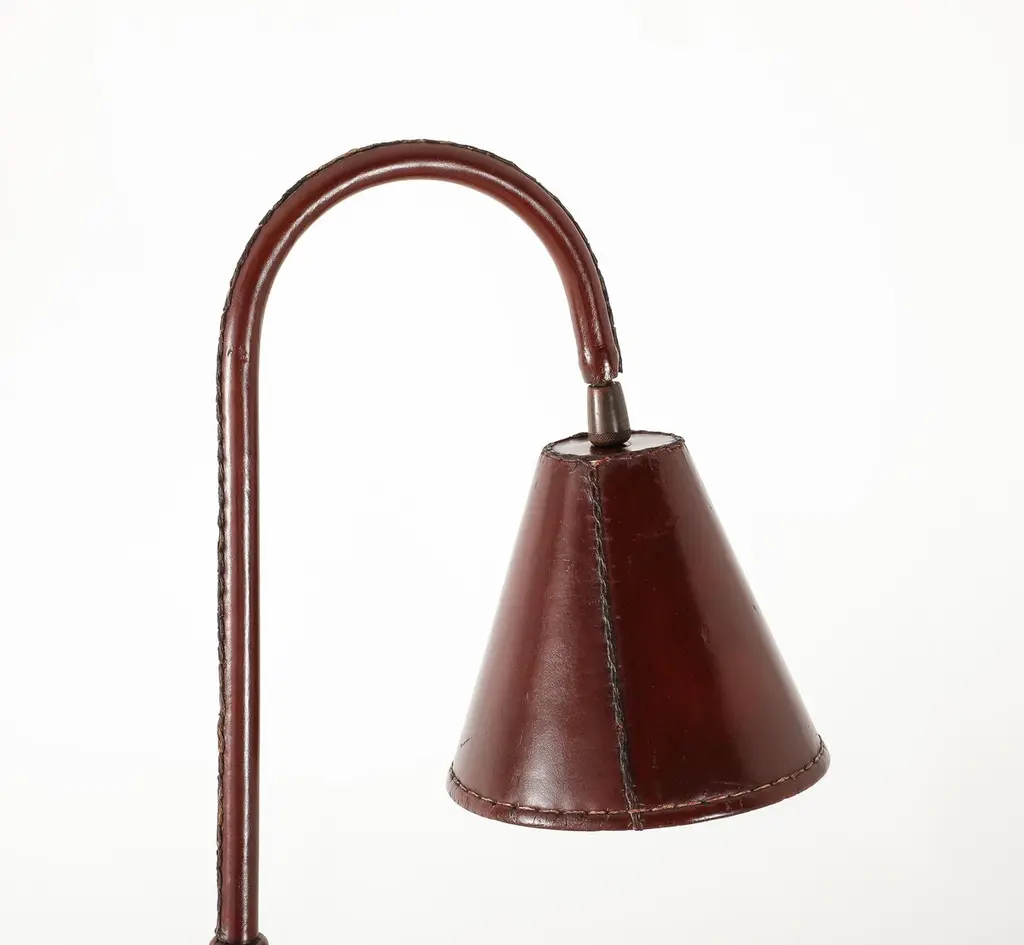 A Stitched leather covered desk lamp by Valenti, steel construction with brass swivel.