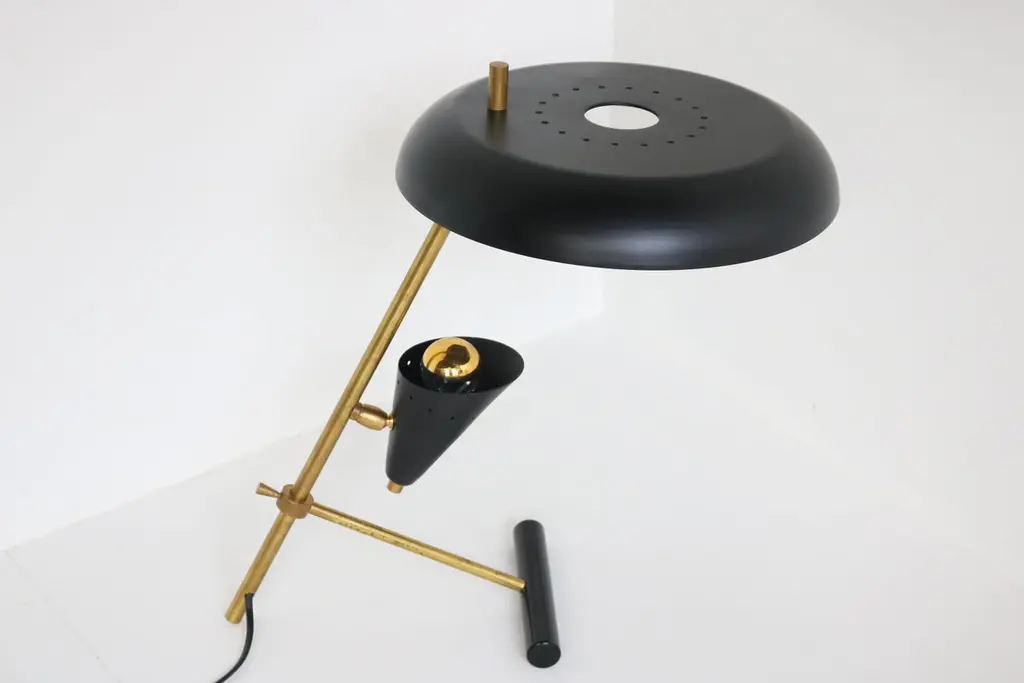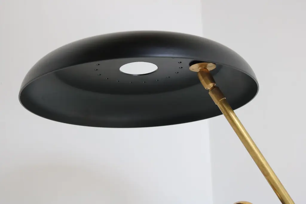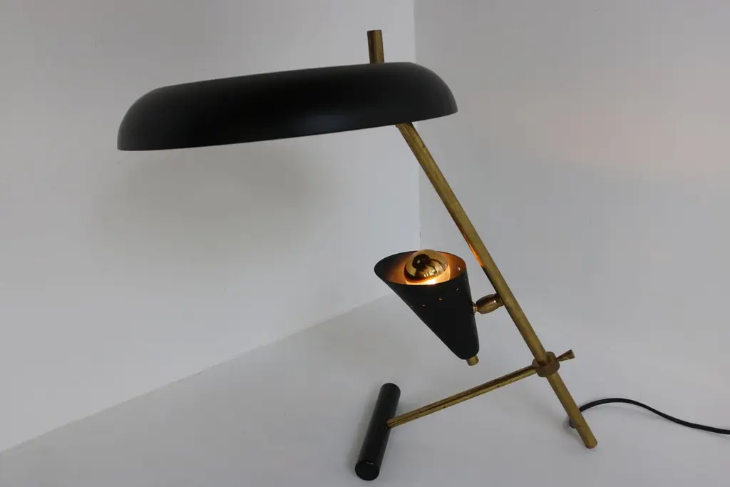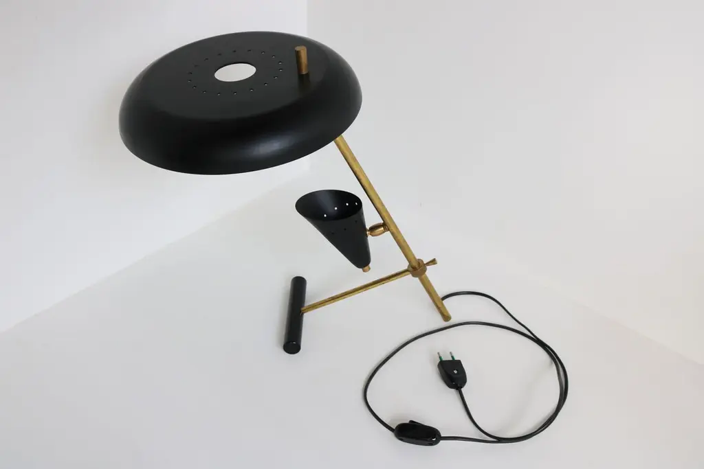 1 of 2 gorgeous Italian vintage design desk / table lamp attributed to Stilnovo. Minimalist design with the well known midcentury ''Z'' design shape. Made out of brass & black metal. You can adjust the shade to your own desired angle new wiring, ready for years of useComes with free shipping safely packed from Amsterdam to you in 7 days.