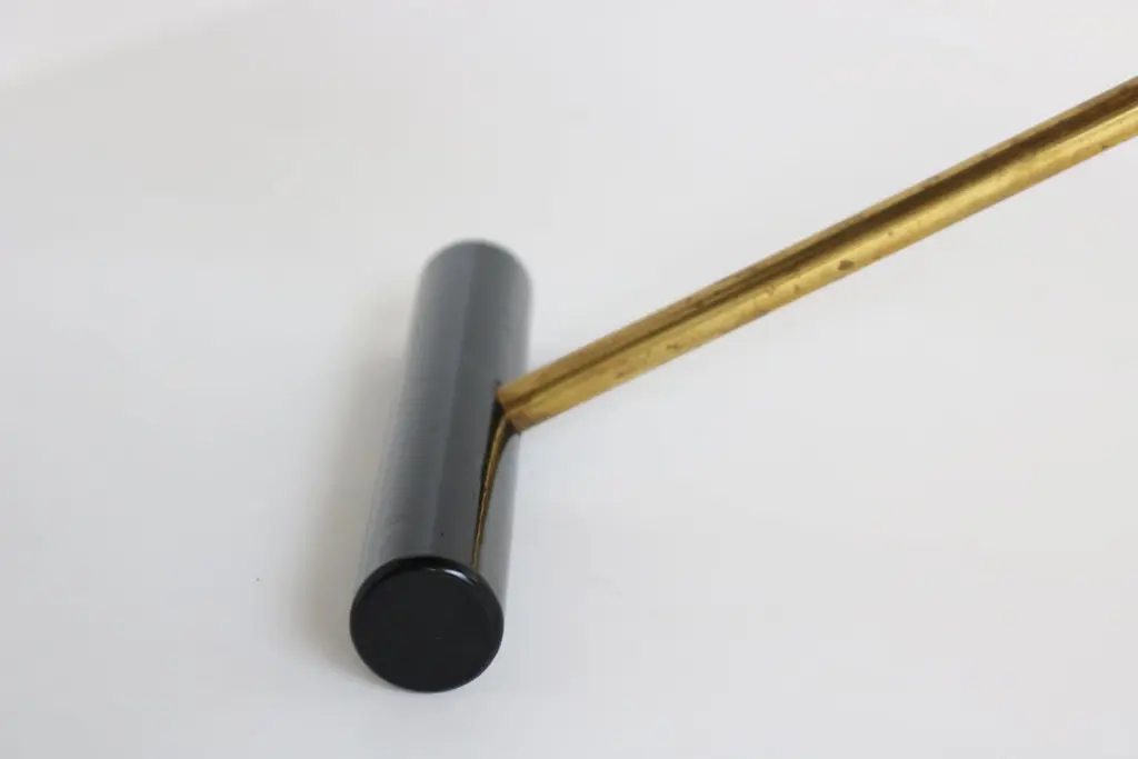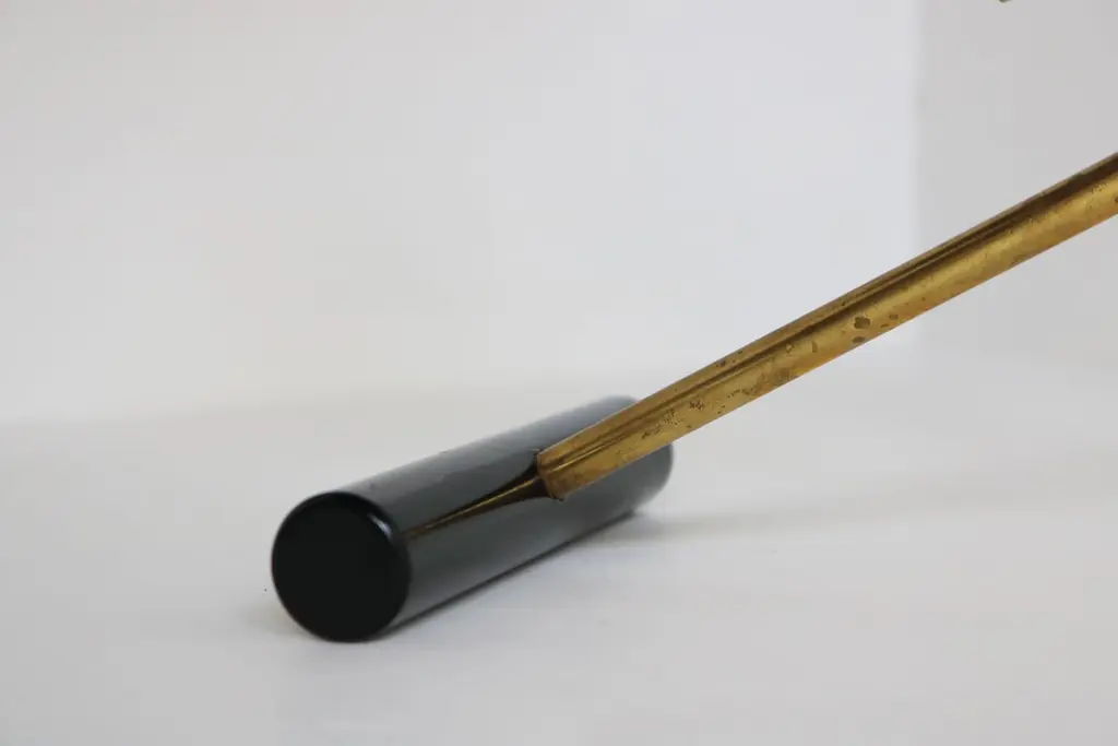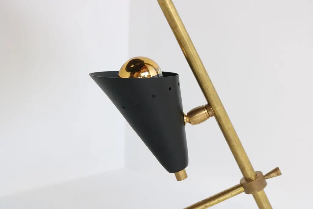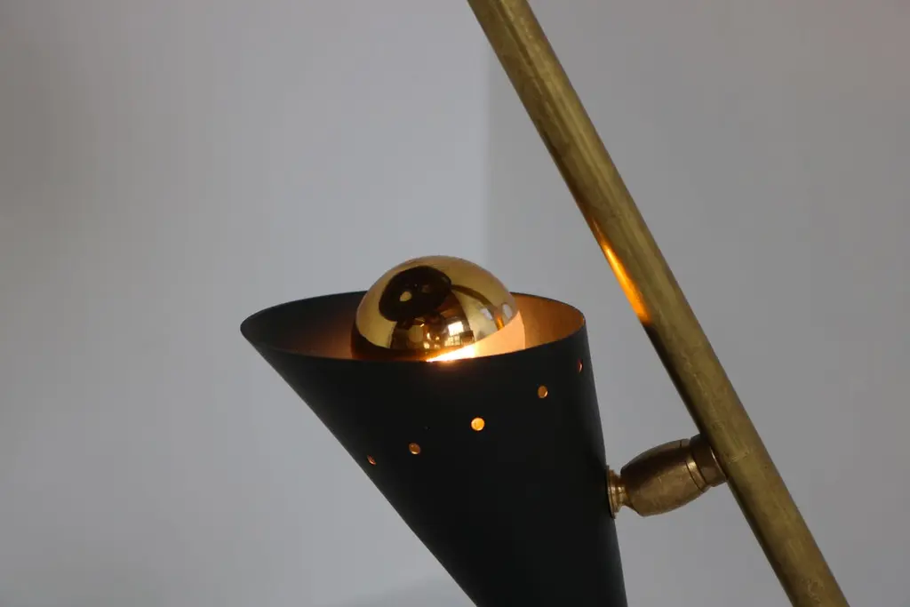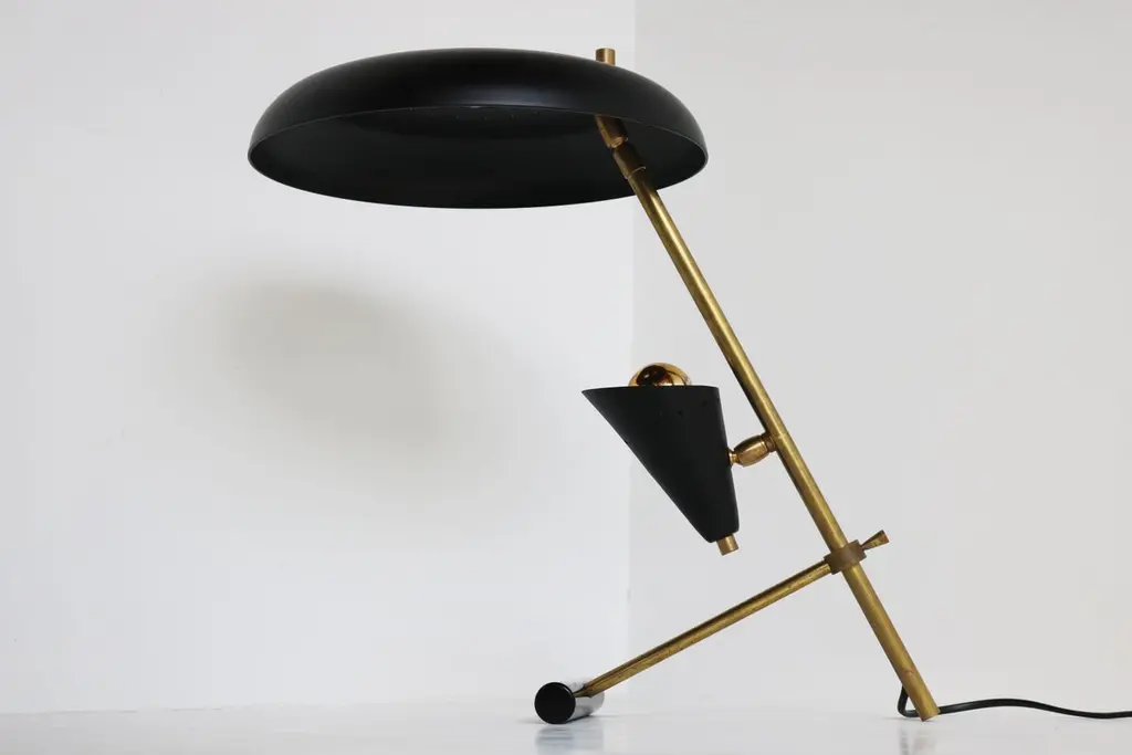 1 of 2 gorgeous Italian vintage design desk / table lamp attributed to Stilnovo. Minimalist design with the well known midcentury ''Z'' design shape. Made out of brass & black metal. You can adjust the shade to your own desired angle new wiring, ready for years of useComes with free shipping safely packed from Amsterdam to you in 7 days.