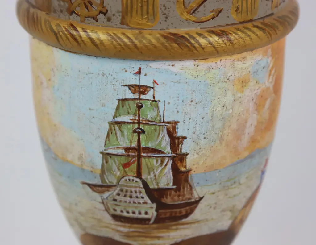 Evoke feelings of the high seas with nautical deco painted above and below a 360 degree scene of coastal sailing. Size: 6" * 6“ * 22"