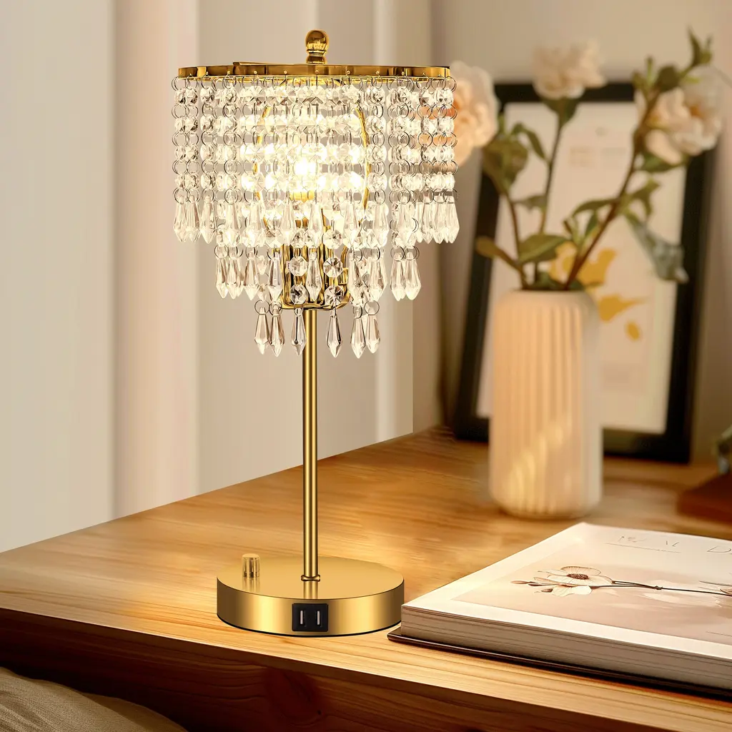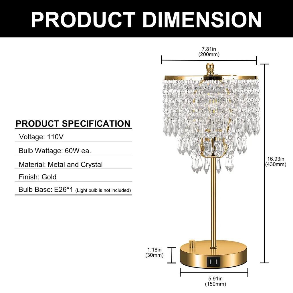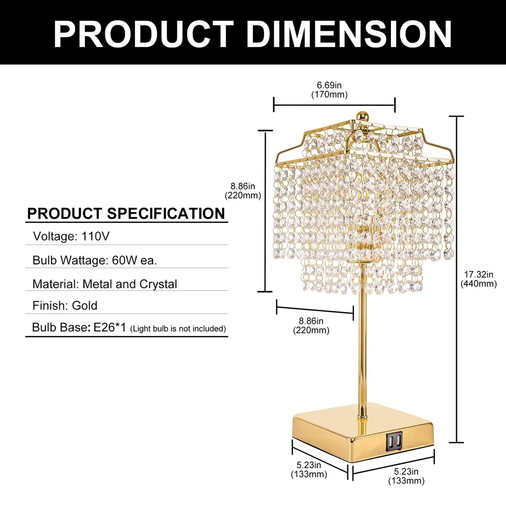 Product Description: This elegant crystal table lamp combines style and functionality, featuring dual USB charging ports and stepless dimming, making it a perfect addition to any modern bedroom, living room, or office. With a single E26 bulb socket (bulb not included), this lamp offers customizable lighting for reading, working, or relaxing. The crystal base adds a touch of sophistication, while the dual USB ports provide convenient charging for your devices, making it an ideal lamp for desks, nightstands, or bedside tables.FEATURES: