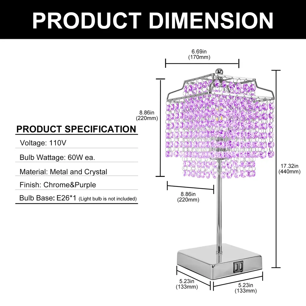 Yansun 17.32 In. Chrome Dimmable Desk Lamp With Clear Crystal Shade And Usb Port E26 For Bedroom, Living Room No Bulb Included
