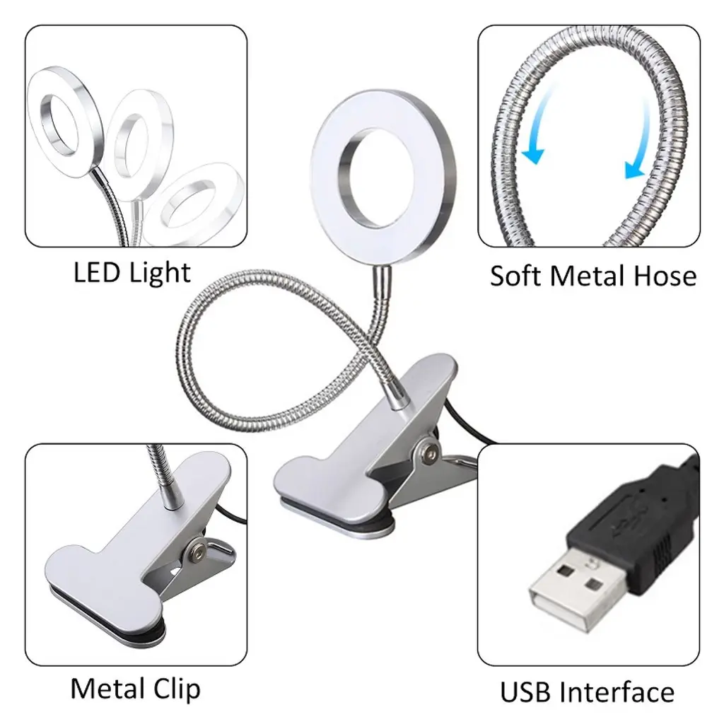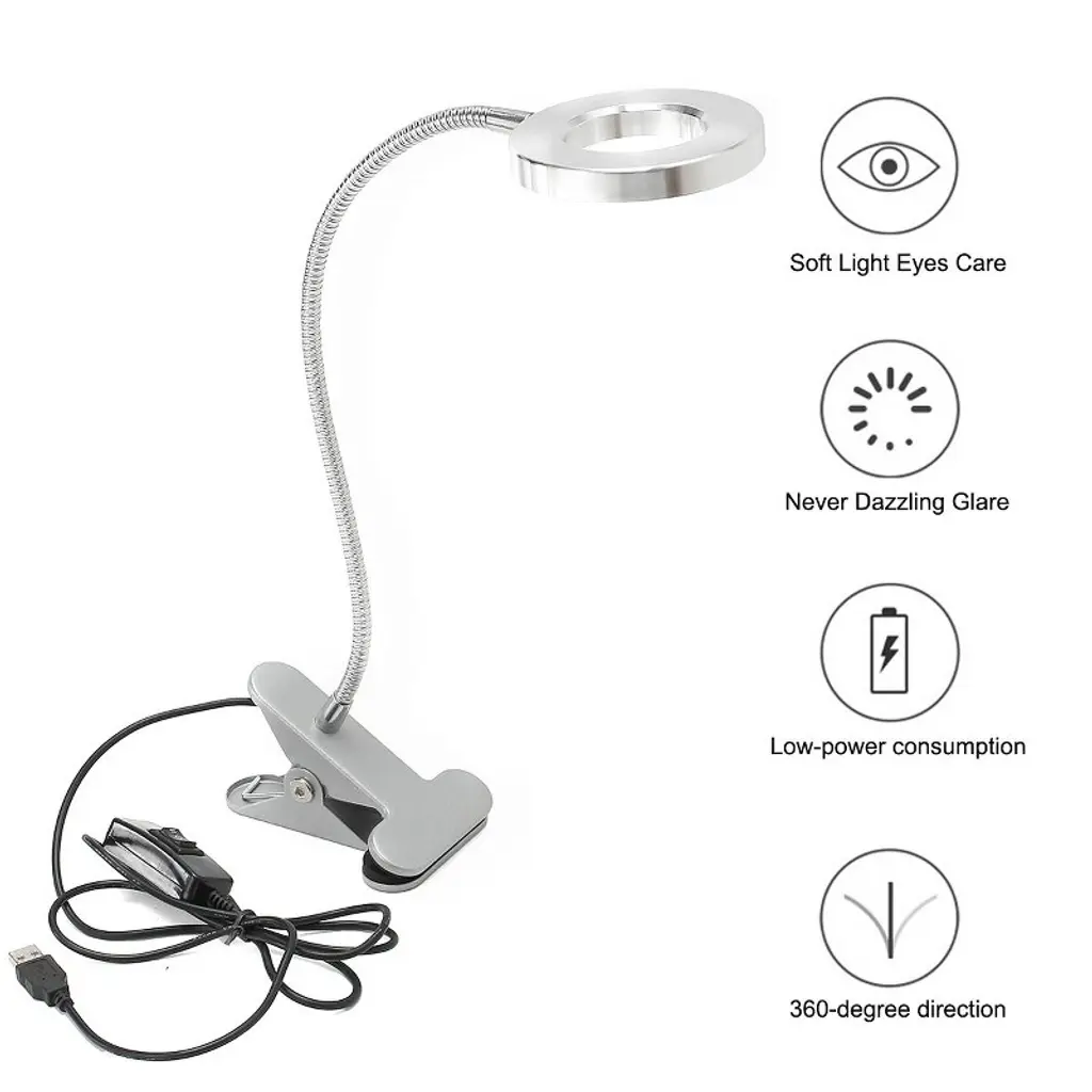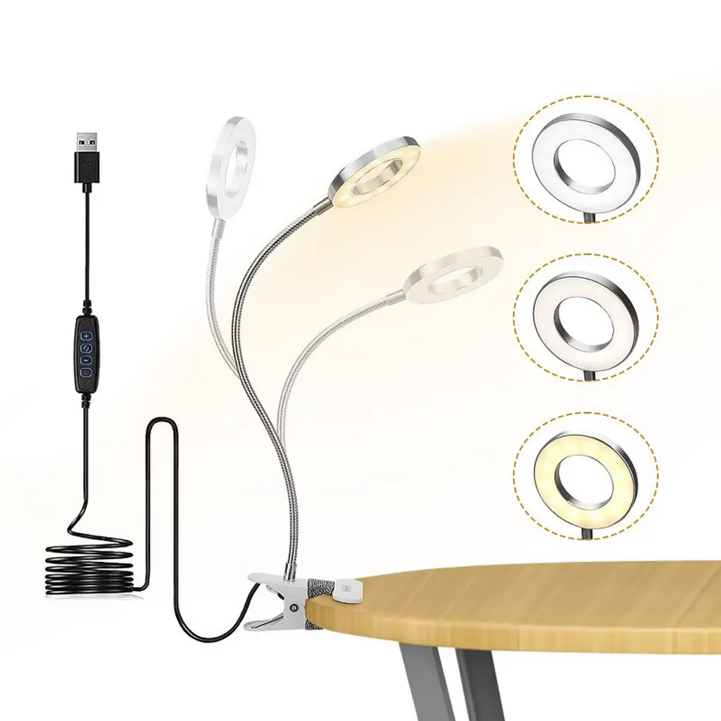 Light up your world with the Adjustable Clip-On Desk Lamp, the ultimate portable lighting solution for women on the go!Whether you're reading in bed, studying at your desk, or perfecting your makeup, this versatile lamp has got you covered. With 10 adjustable brightness levels and 3 soothing lighting modes (warm, warm-white, and white light), you can easily set the perfect mood for any activity.The 360 degree flexible gooseneck lets you position the light exactly where you need it, while the non-slip clip protects your furniture and ensures the lamp stays in place. Plus, it is powered by USB, making it easy to plug into your laptop, power bank, or any USB adapter. Whether you're working late, relaxing before bed, or getting ready for a night out, this compact, lightweight desk lamp is your perfect lighting companion.Add a touch of style and practicality to your space with the lamp, compact, adjustable, and always ready to brighten your day (or night)! SPECIFICATIONSFinish Type: PaintedBase Material: MetalProduct Dimensions: 6.02"D x 4.25"W x 15"HItem Weight: 10.88 ouncesLamp Type: Reading light, Desk lamp, Makeup light, Clip on lightShade Color: WhiteShade Material: MetalSwitch Type: Push ButtonStyle: ModernColor: SilverSpecial Feature: Corded, PortableLight Source Type: LEDMaterial: MetalRoom Type: Kids Room, Office, Bedroom, Study RoomCONTACT USIf you have any problems with our items or services, please feel free to contact us any time.We are always online and do our best to solve your problems and provide you with the best customer services.