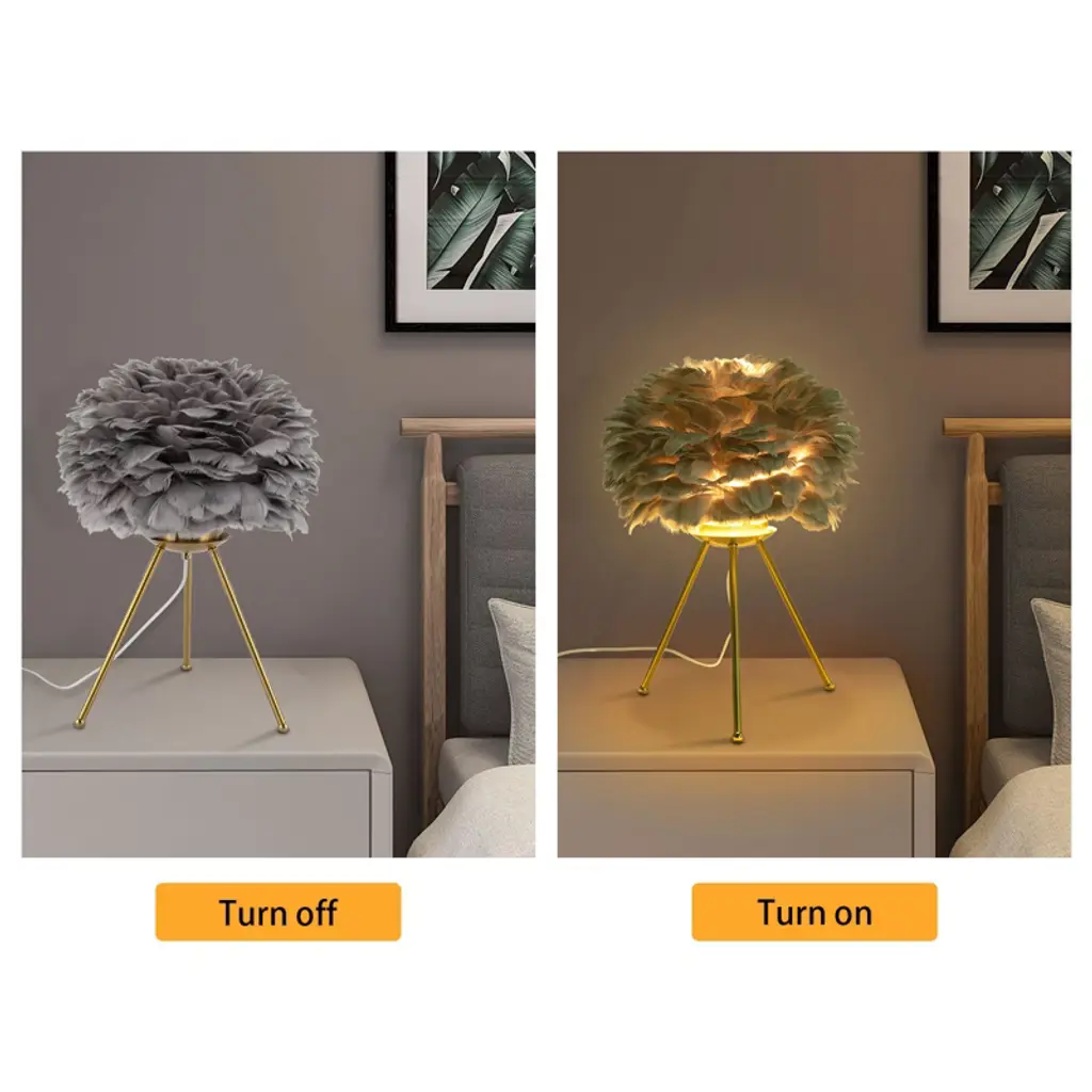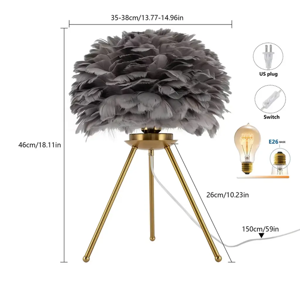 Elevate your space with this elegant white feather table lamp, designed to bring a touch of warmth and romance to any room. Inspired by the lightness of natural feathers, its exquisite shade is crafted from meticulously selected white feathers, creating a soft, cloud-like visual effect. The luxurious gold-finished iron base and high-quality glass construction ensure both durability and a stunning, sophisticated look. This lamp casts a beautiful, refracted glow, making it a perfect statement piece for bedrooms, living rooms, or as a unique decorative accent. Combining artistic design with practical features like stable support and easy installation, it’s an ideal choice to add a dreamy ambiance to your home. Specification Material: Iron, Glass, Feather Color: Gold, White, GrayProcess: Electroplating, Dyeing Energy Efficiency: E Lamp Type: Table Lamp Indoor/Outdoor Usage: Indoor Controller Type: Hand Control Control Method: Push Button Switch Power Source: Corded Electric Plug Standard: US Standard Voltage: 110V Power: ≤60W Irradiation Area: 3-5㎡/32.29-53.82 ft ² Number of Light Sources: 1 Number of Support Foot: 3 Light Source Type: E26 (Not Included) Assembly Required: Yes Support Foot Height: 26cm/10.23in Feather Length: 8-10cm/3.15-3.94in Feather Shade Diameter: 35-38cm/13.77-14.96in Power Cord Length: 1.5m/4.93ft Overall Height: 46cm/18.11in
