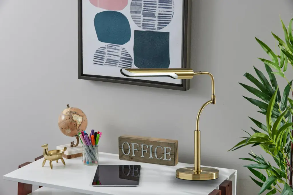 Introducing the 3957-21 Zane LED Desk Lamp, a sleek and modern lighting solution designed to elevate your workspace. With its brass finish and contemporary design, this desk lamp effortlessly blends style and functionality. Standing at a height of 17 inches, the Zane Desk Lamp is compact yet impactful, making it the perfect addition to your desk or work area. The adjustable shade allows you to direct light precisely where you need it, while the 10W LED provides energy-efficient and glare-free illumination. The touch smart switch offers three brightness levels and three color temperature settings, allowing you to customize your lighting to suit your tasks and preferences. The lamp''s beige fabric-covered cord adds a touch of sophistication to its overall aesthetic.Experience the convenience of modern lighting technology with the 3957-01 Zane LED Desk Lamp. Whether you''re working, studying, or reading, this lamp offers the perfect lighting solution to enhance your productivity and comfort.Contemporary Design: The 3957-21 Zane LED Desk Lamp features a sleek brass finish and a modern design, making it a stylish addition to any workspace.Adjustable Shade: Customize your lighting experience with the adjustable shade, allowing you to direct light precisely where you need it for optimal productivity.Energy-Efficient LED: The 10W LED provides bright and energy-efficient illumination while reducing glare, making it perfect for long hours of work or study.Smart Touch Control: The touch smart switch offers three brightness levels and three color temperature settings, enabling you to create the ideal lighting conditions for various tasks.Sophisticated Cord: The lamp is equipped with a beige fabric-covered cord that not only complements its design but also adds a touch of sophistication to your workspace.