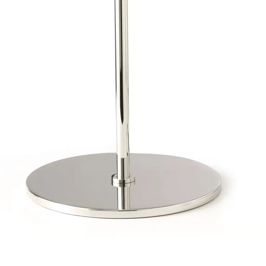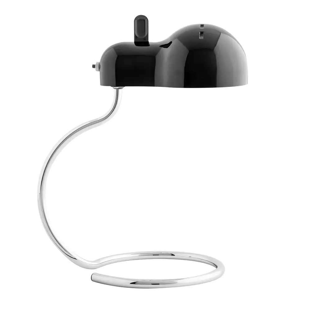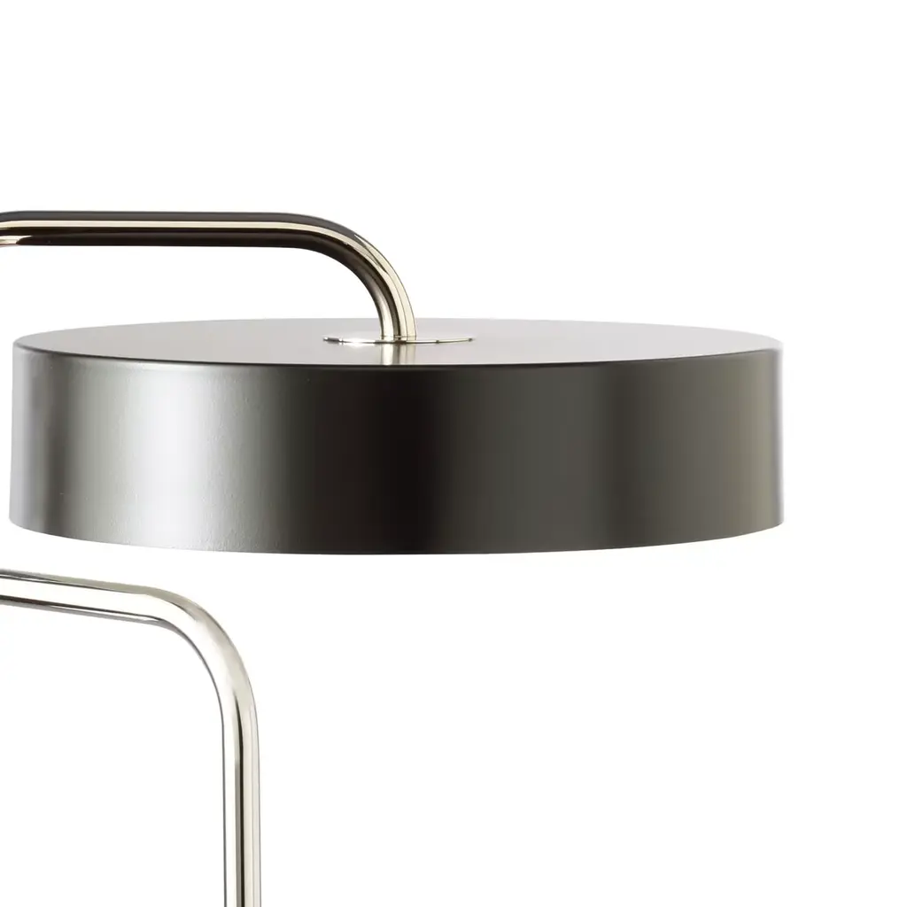 This striking desk lamp is entirely made in metal with a nickel finish and paired with a metal shade painted in a darker tone. This subtle color variation adds elegance to the contemporary silhouette of this piece that features a small round base supporting an elongated shaft that curves to accomodate the large and narrow cylinder of the shade projecting the light downward. The lamp has a fixed, non-swivelling arm. Ideal to brighten any room in a modern setting.