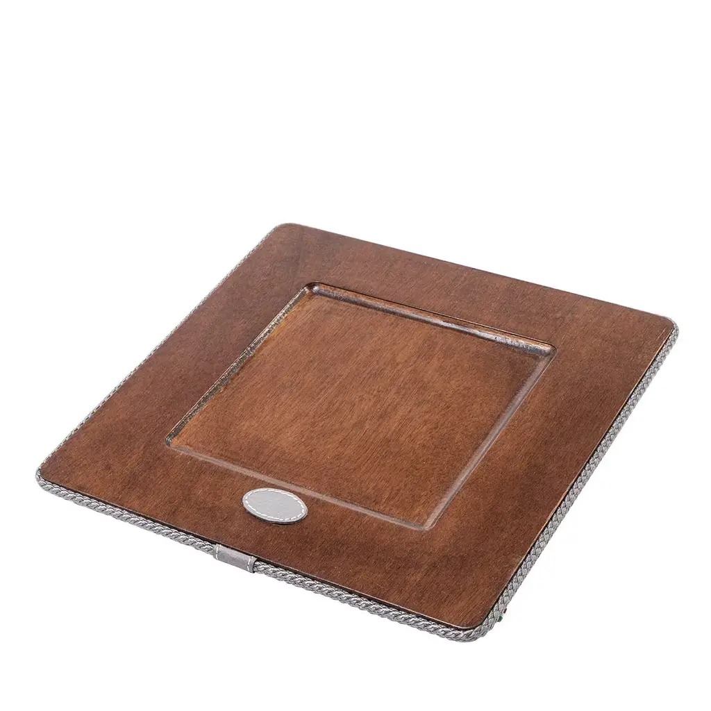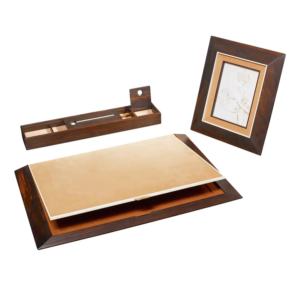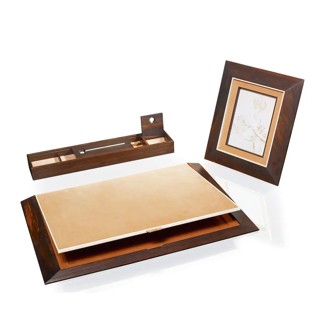 This elegant desk pad in ebony wood has a shutter covered in nubuck leather and it is highlighted at the edges with a horn frame. The interior is finished with a contrasting color. It perfectly complements the Dorian pen tray.