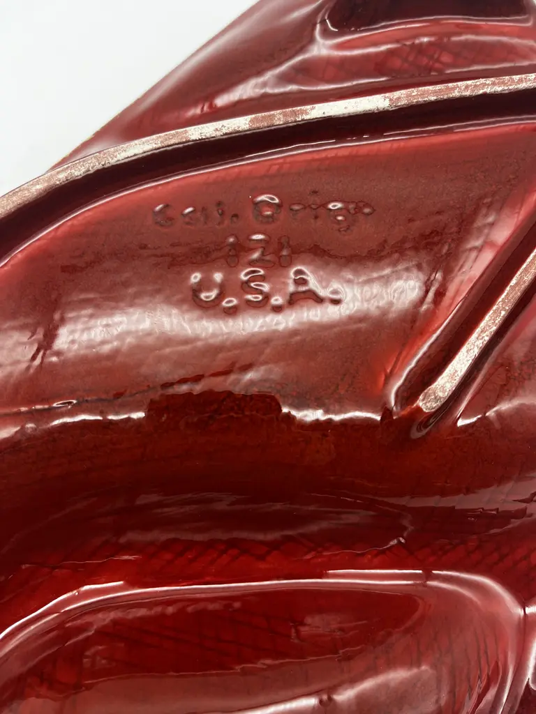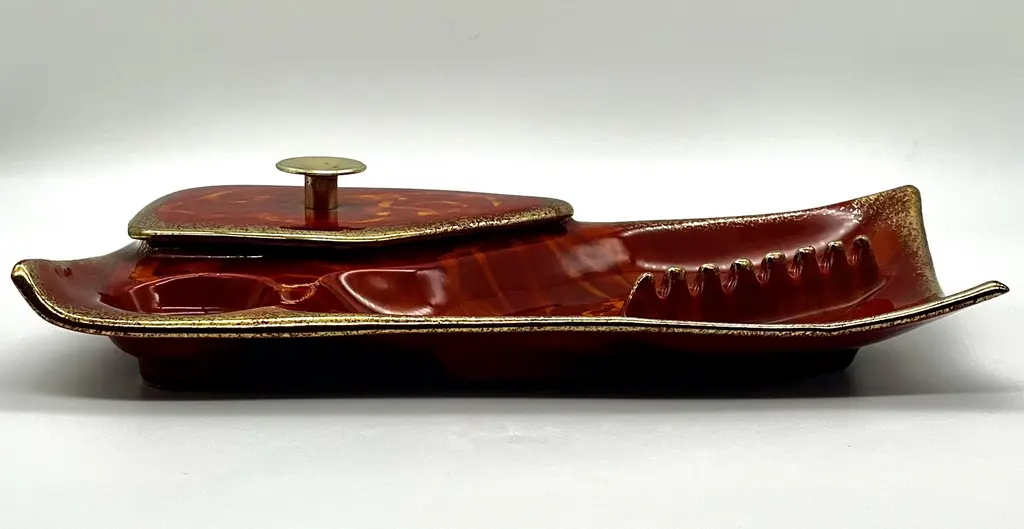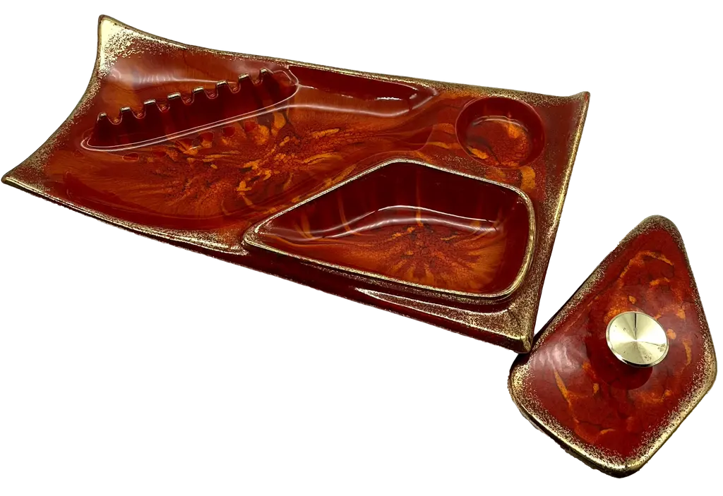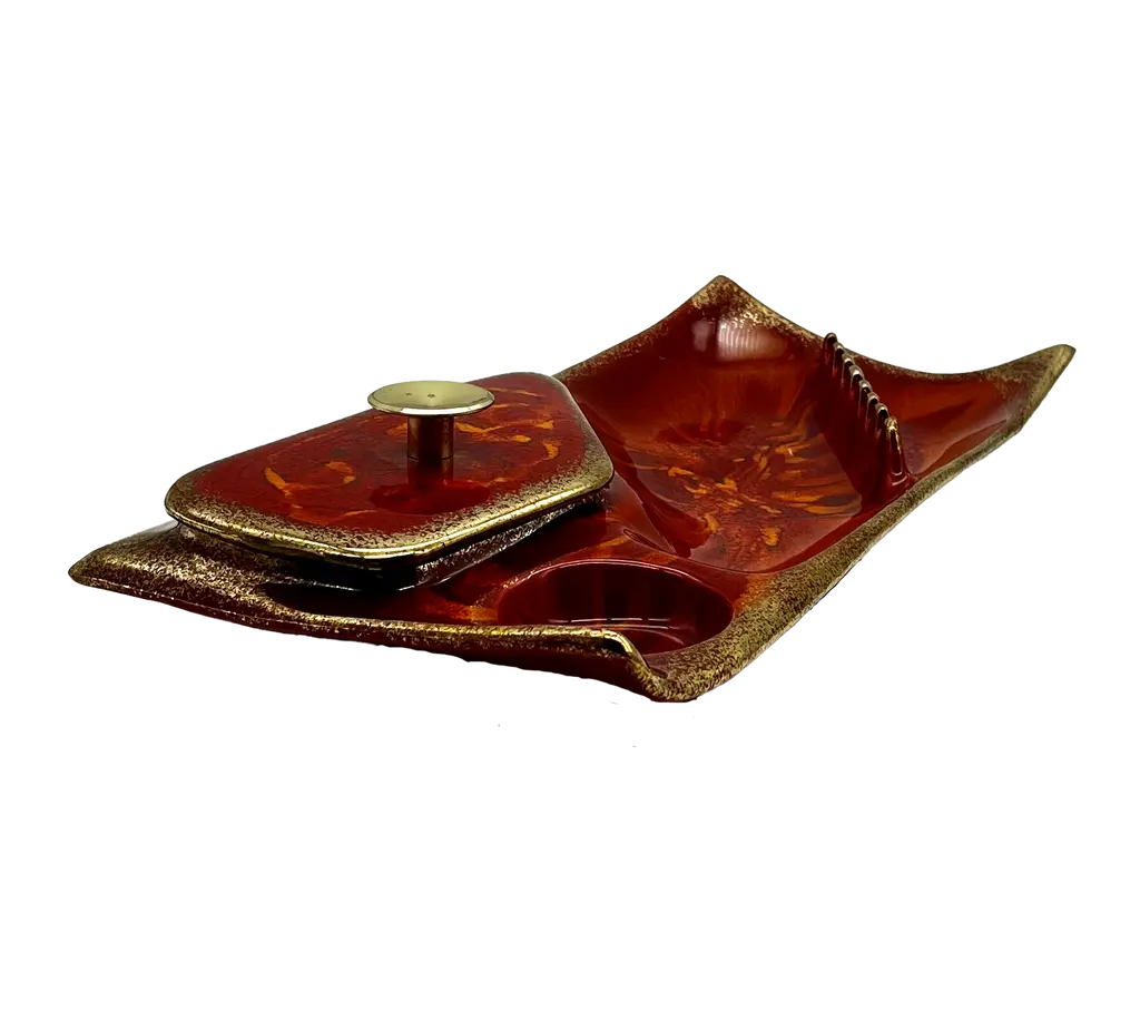 C. 1960s Mid-Century Modern red and orange glazed ceramic desk set with ashtray, circular compartment and asymmetrical compartment with round brass handled lid. Gold rim around base and lid. Stamped "Cal. Orig. 121 U.S.A" on underside. Classic mid-20th century American design.