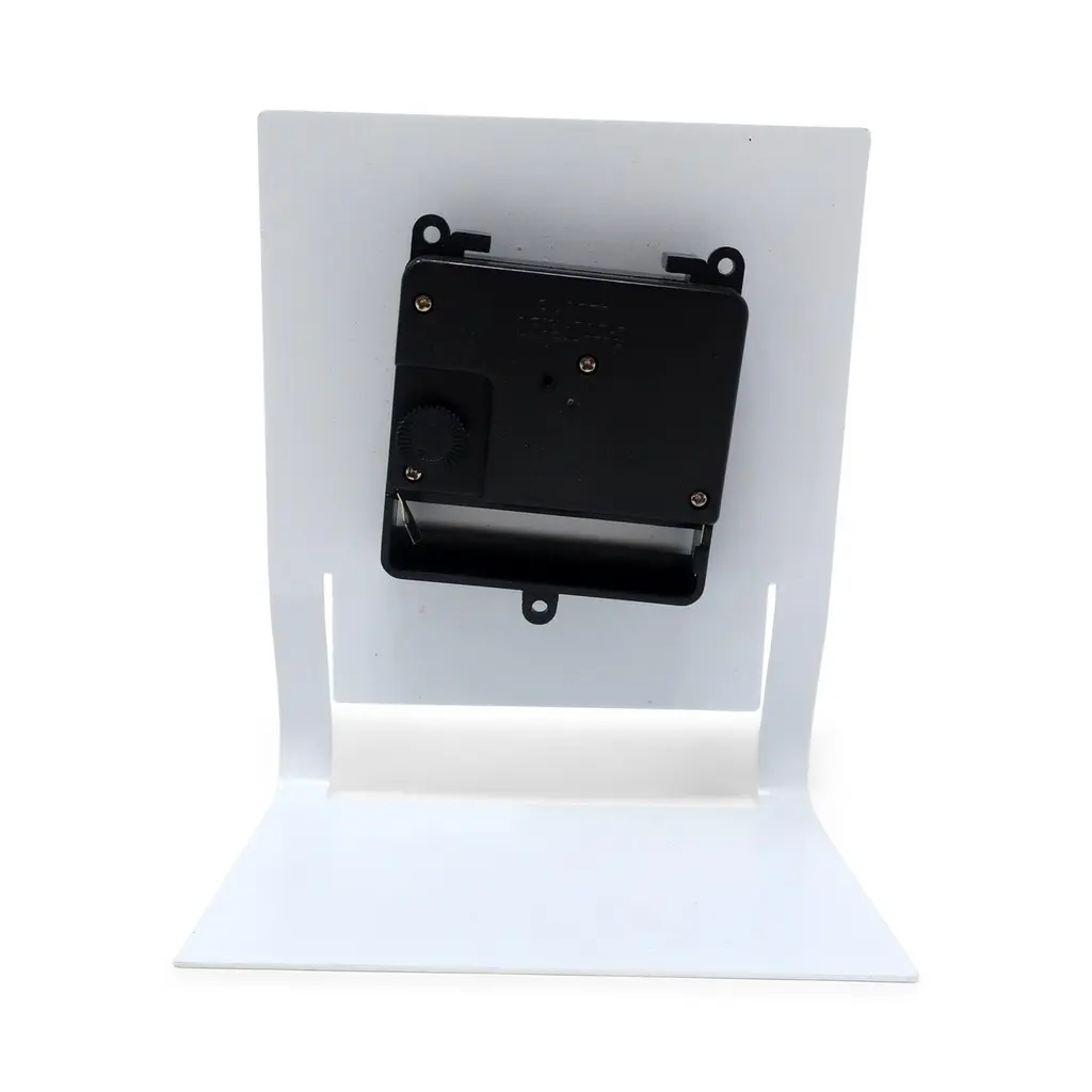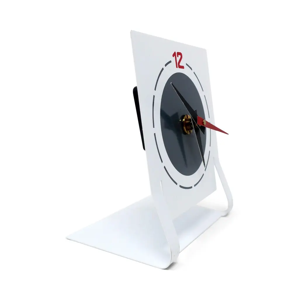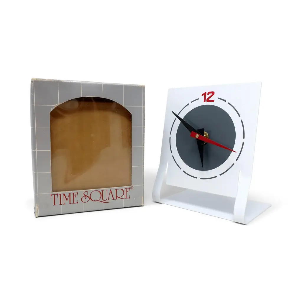 A postmodern desk or table clock by Time Square. This "fashionable timepiece" (the manufacturer's language on packaging) is constructed from a piece of bent white powder coated metal to create a built in stand. Dark gray face with dashed circular line to create the numbers on the face, as well as black and red hands.In very good vintage condition and in original packaging. Takes a single AA battery and keeps great time. Measures: 4" x 3" x 5".