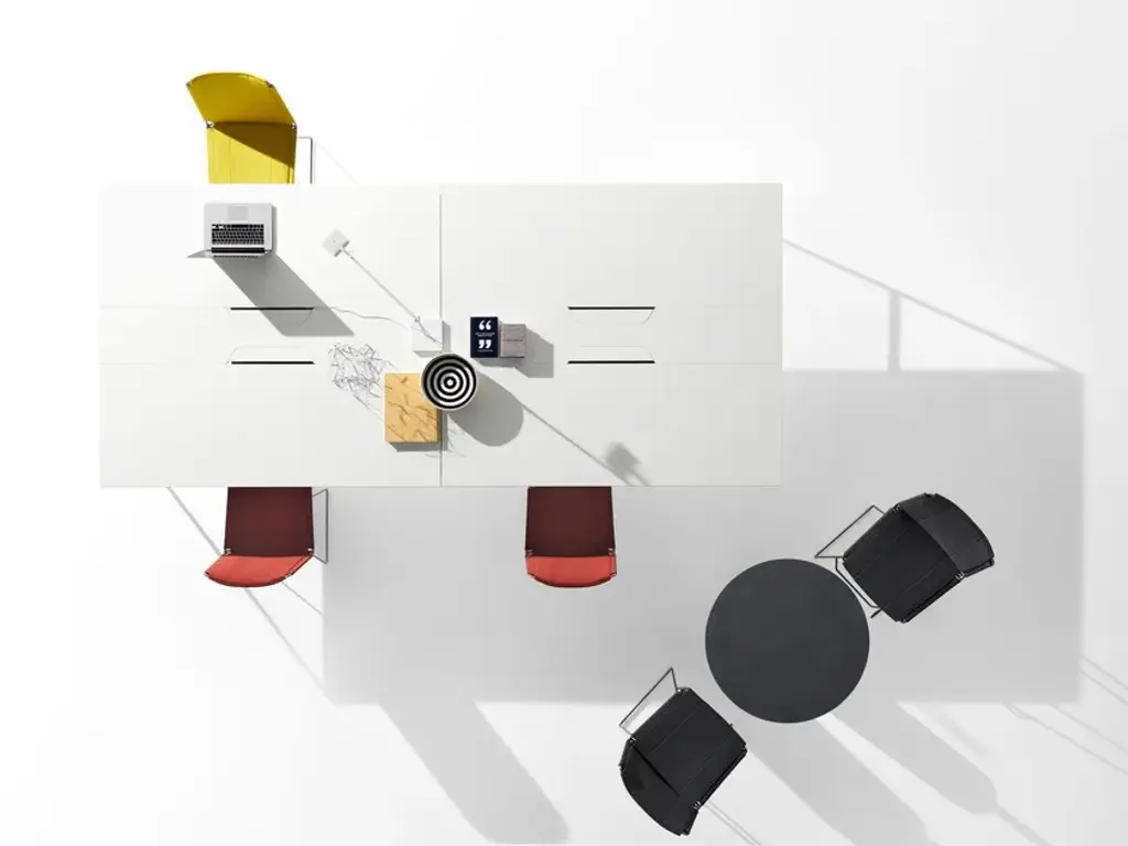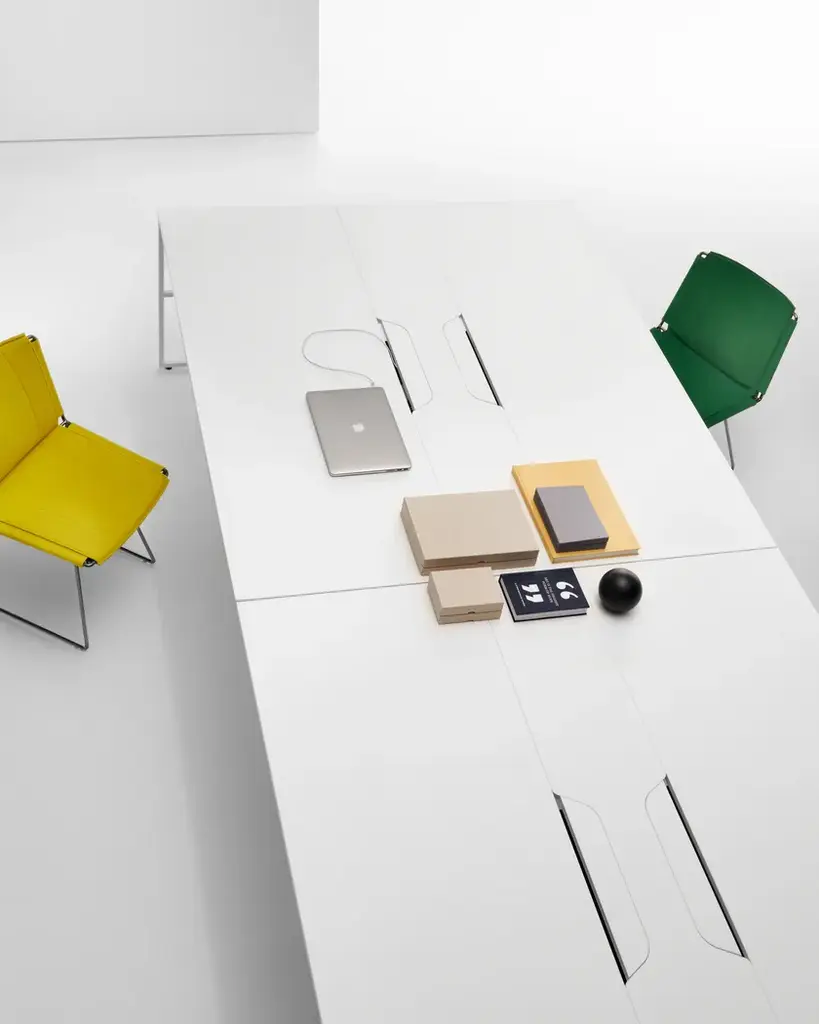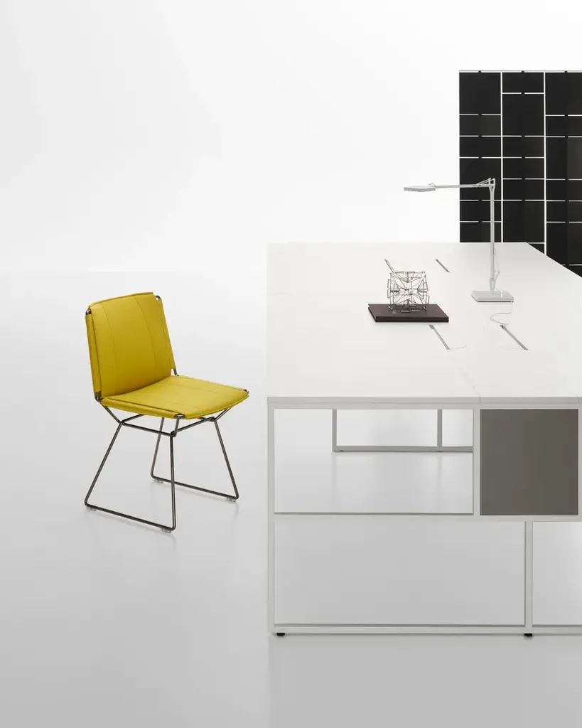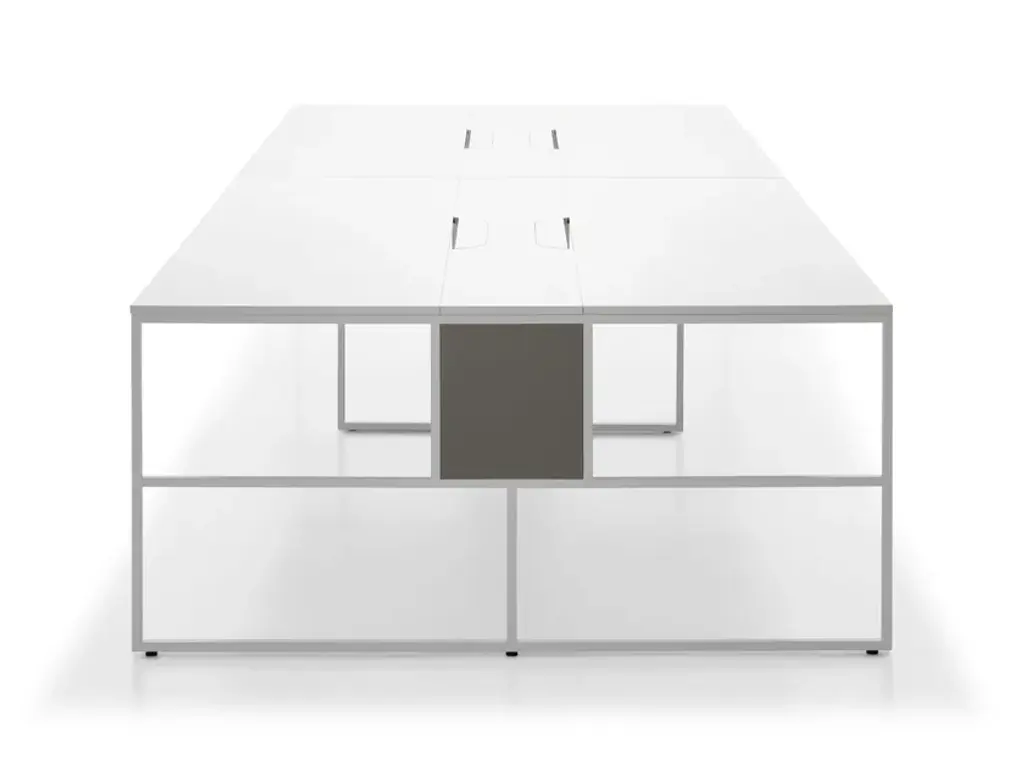 The 20.Venti Light collection is the result of the simplification of the 20.Venti system, to provide a wider offer able to respond to different market needs. The collection includes double aggregable workstations with a wide range of accessories.An intentionally iconic system that renounces unidentifiable stylistic solutions. Basic minimal style that enhances both design and function. Designed by 967Arch for MDF Italia to offer an extensive choice of dimensions and finishes for working areas.Frame and topMatt white, light grey or black melamine tops. Steel frame and legs, section 20x20 mm, painted with epoxy powder in the matt colours white and graphite grey.Dimensions and typesSingle Desk, table depth 90 cm, lengths 160 and 180 cm; height 75 cm and adjustable aluminium foot with range of +/- 1 cm. Equipped with cable opening on the top.Light workstation two users, table depth 160 cm, lengths 160 and 180 cm; height 75 cm and adjustable aluminium foot with range of +/- 1 cm. Equipped with cable opening on the top.Light workstation four users, table depth 160 cm, lengths 320 or 360 cm; height 75 cm and adjustable aluminium foot with range of +/- 1 cm. Equipped with cable opening on the top.Light Flex workstation, table depth 160 cm, in sizes that can be customised as required by using terminal or intermediate modules in the lengths 160 or 180 cm; height 75 cm and adjustable aluminium foot with range of +/- 1 cm. Equipped with cable opening on the top.Accessories• finishing panels for the side frames of workstations,On request finishing panels in navy blue x165, burgundy X163, English green X164 and dune X162. lacquers.Feasibility, prices and delivery times are to be checked with the sales office.• Transparent plastic cable spring with aluminium painted base.• Under-top tray for cable collection.