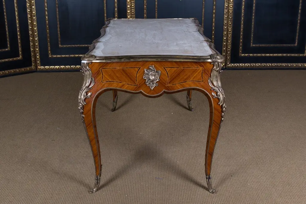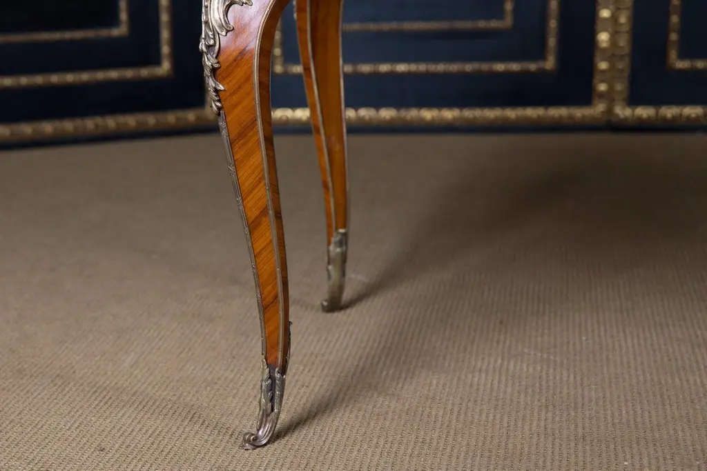 In Bois-Satiné veneer, all-round full-length mirror veneer with seed beads. Extremely fine, floral, bronze fittings in the form of chutes, handmade patinated bronze. Rosewood veneered on solid beechwood. Strong cambered, four-sided passively curved three-bar frame base with wide knee patch on elegantly curved squares in sabots.Slightly protruding tabletop with a fantastically curved, profiled bronze framing. Very nice corner fittings. Cover plate can be covered at an extra charge with high-quality leather. Pattern color of the leather on request.