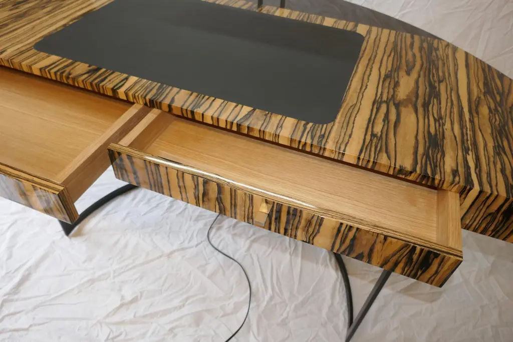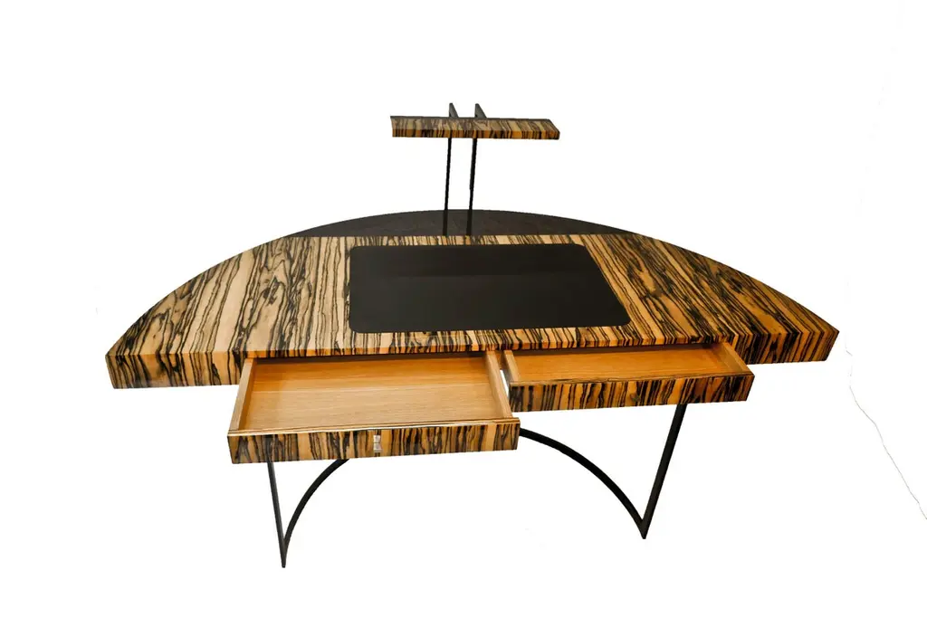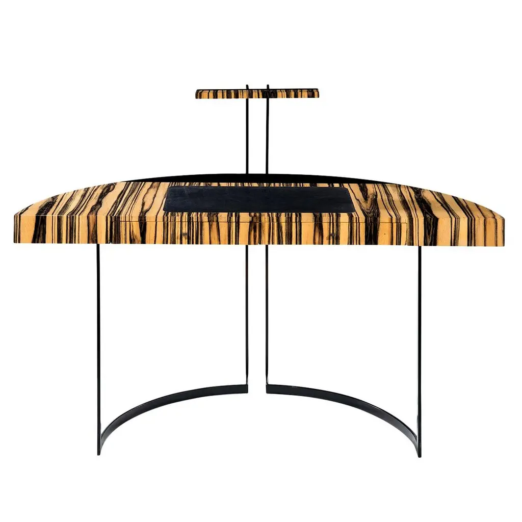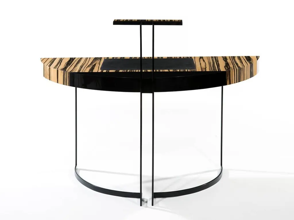 A semi-circular black lacquered metal legged desk with a white ebony veneer top and black leather desk blotter. The top of the back legs ends with a LED light.Do not hesitate to ask for a shipping quote to get the best offer.Aymeric Lefort (b. France 1971)Lefort's decision to become a designer was inspired by the furniture of Jean Royere in his family home in France. After finishing his studies in cabinet making at the renowned Institut de St Luc in Tournai, where he specialised in design, he went on to complete his training in the workshops of cabinet makers, interior decorators, and upholsterers in Brussels where he was motivated by his desire to learn new techniques in the decorative arts.These apprenticeships gave him a thorough grounding and an enviable technical knowledge in the art of cabinetmaking; this, combined with his commitment to the highest levels of craftsmanship which Lefort brings to his contemporary designs, continues a long tradition of French cabinetry.Each collection Lefort produces contains his cultural heritage reinterpreted for the modern form to create a minimal, yet often sensual design. Inspired by architecture and with the rigorous techniques of the cabinet maker, Leforts pieces are characterised by the subtle blending of their elements, the quality of the finish and the combinations of materials.
