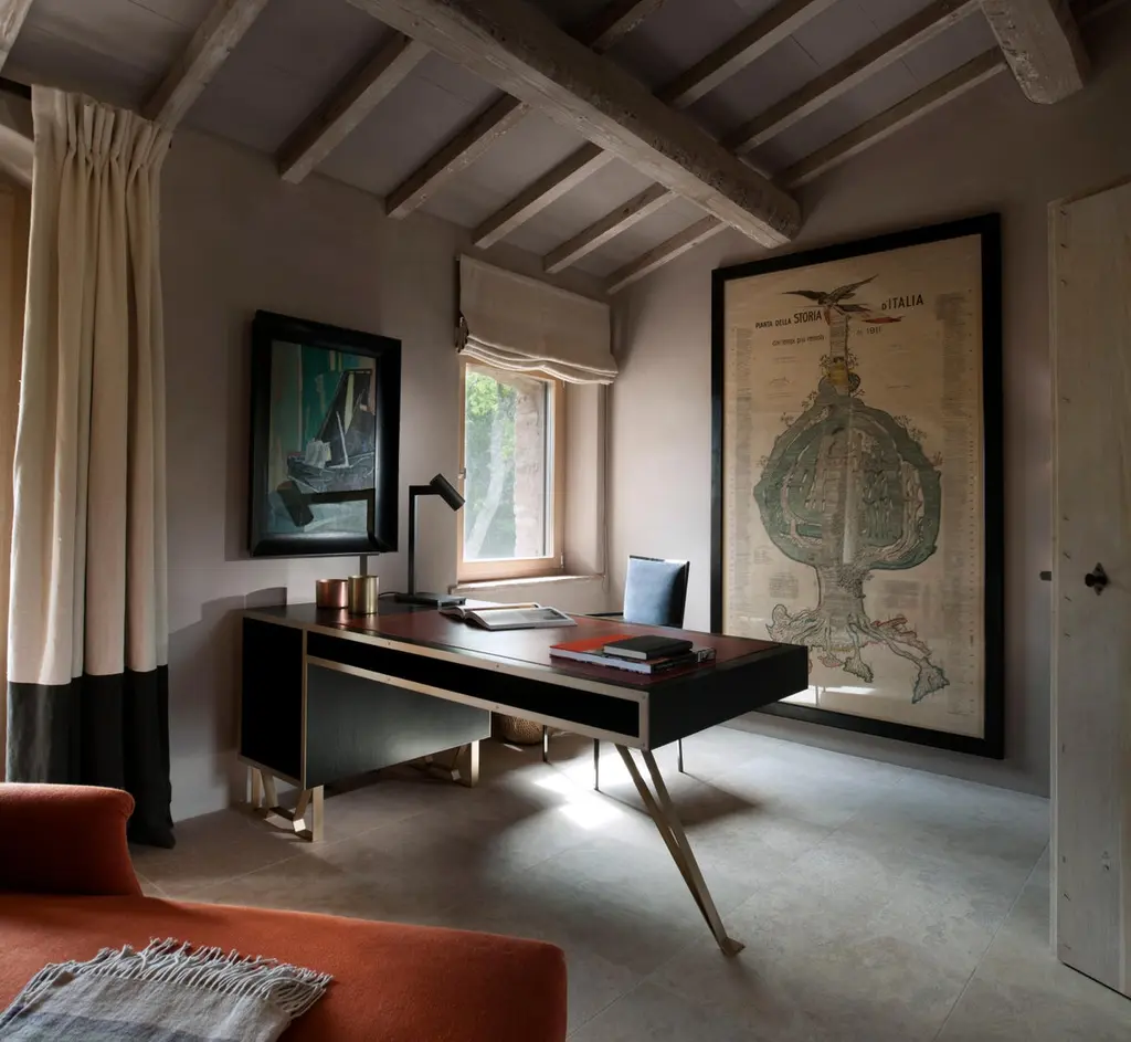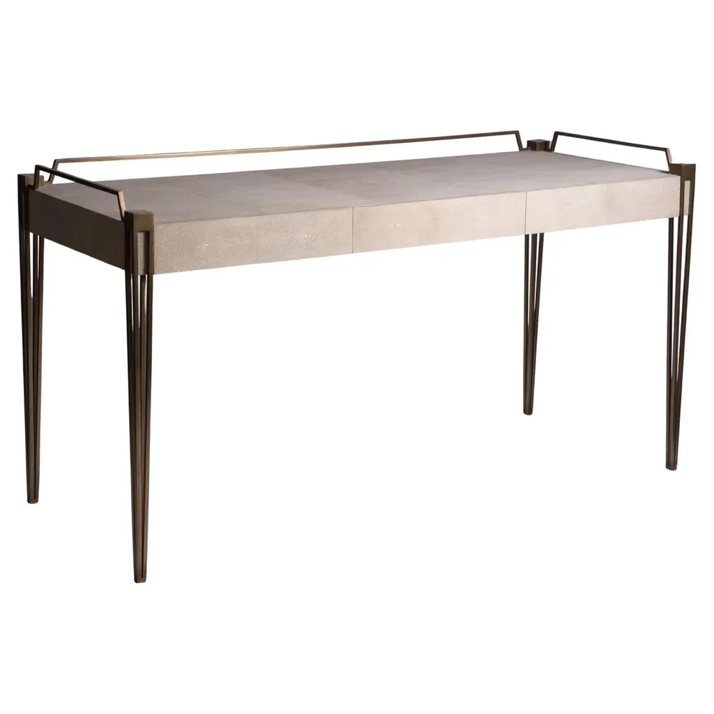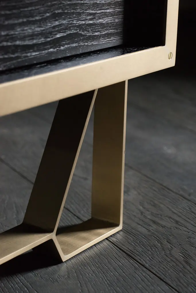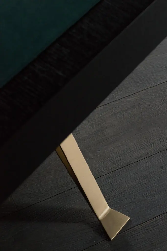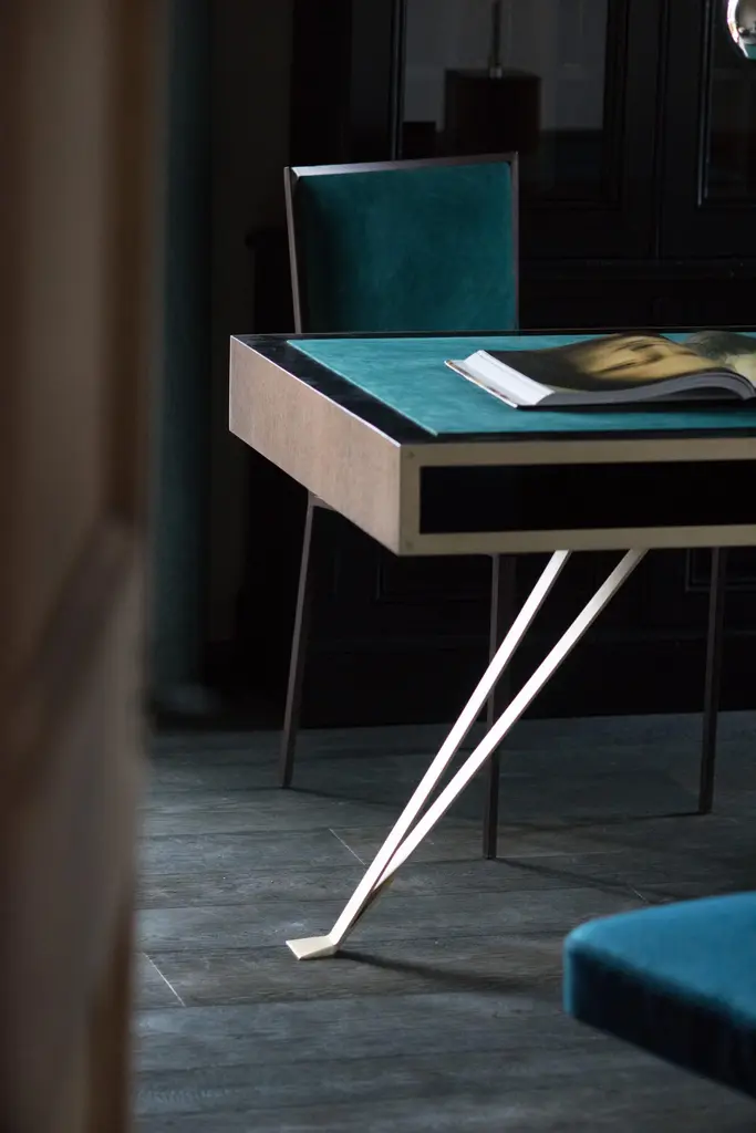 An oak, brass and leather writing deskB.B. - Strong contrasting materials combine – I love how the boxy table and drawers seem to float and balance on different tripod legs. Note the wide open shelf-like storage space underneath the writing areaSpecifications: painted oak veneer structure – Italian leather inlay - 3mm brushed brass slab profile – legs made from solid 5mm brass slab 4 separate wooden drawers.Handmade in Italy.The leather inlay can be realized in different nuances.