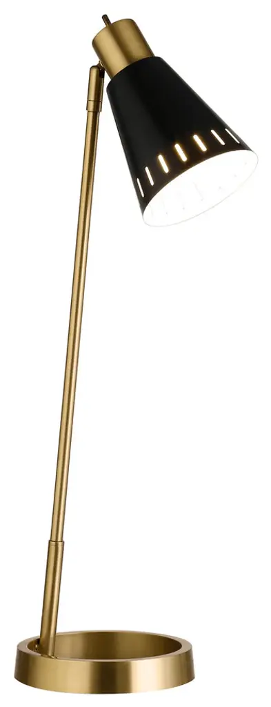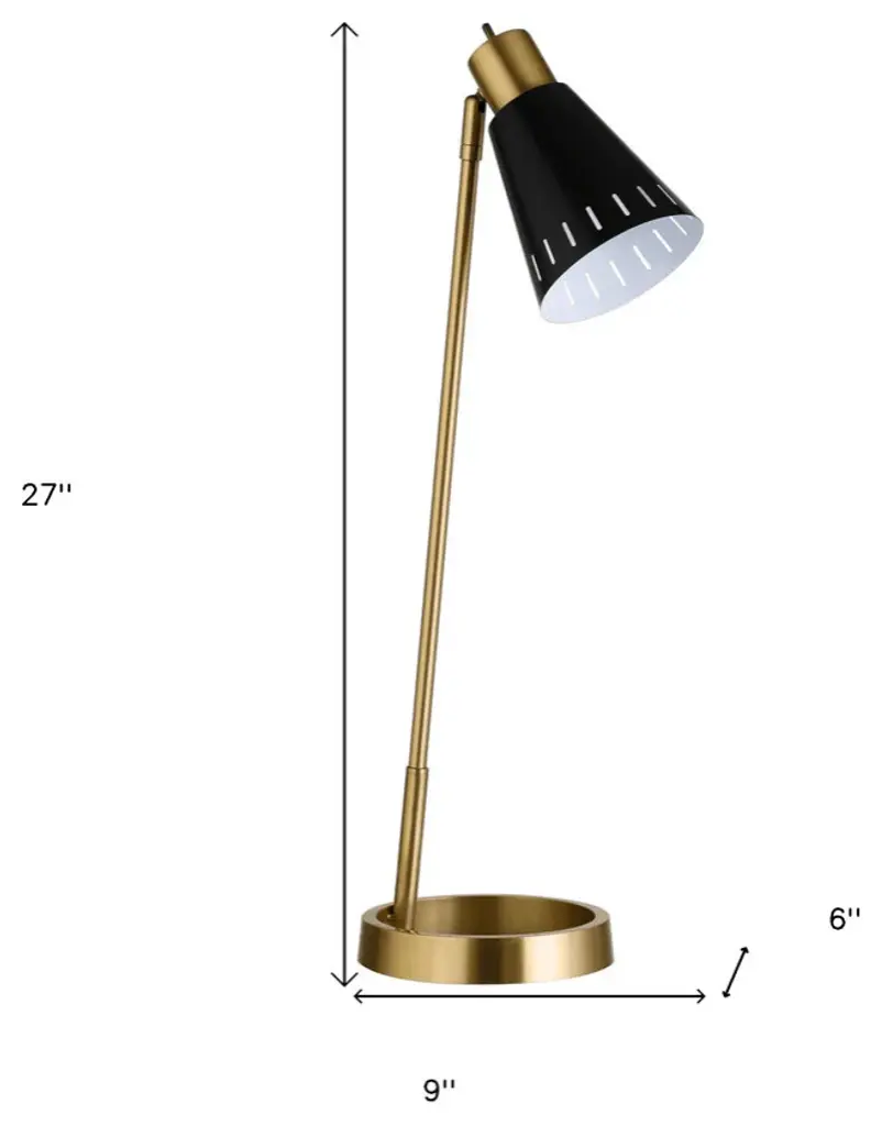 With this 27-inch brass metal desk table lamp with black cone shade you can bring in design to any space along with adding some ambient lighting. A gorgeous brass metal base brings just the right amount of pizzazz to this fabulous lamp. The black cone metal shade is a great compliment to this lamp. This desk lamp provides ''task lighting'' that will illuminate your working area for reading or writing. The light that this lamp throws is soft and warm to elevate the look of most any space in your home. Bring some lite and good vibes into your space with this updated and stylishly designed lamp. 27-inch H x 9-inch W x 6-inch D