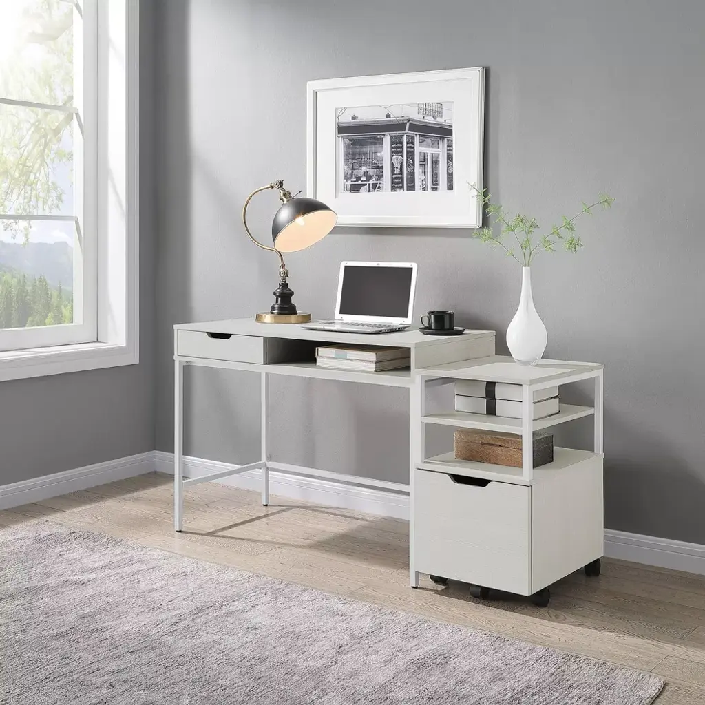 The Contempo Desk's generous 40" x 20" work surface is ideal for your busy home office. The refined lines of the sturdy steel frame will be the focal point in your room. Upper shelf provides space for a monitor. Key storage solutions of 2-Desktop drawers for all your small accessories. Available in white laminate with white metal frame, or brown woodgrain laminate with black metal frame. Assembly is required.
