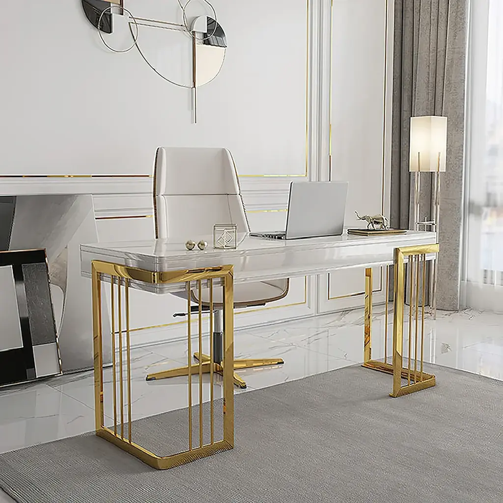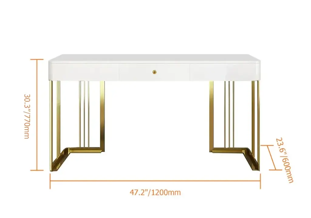 47" Glossy White Wooden Writing Desk Modern Desk Computer Desk With Drawers In Gold Base