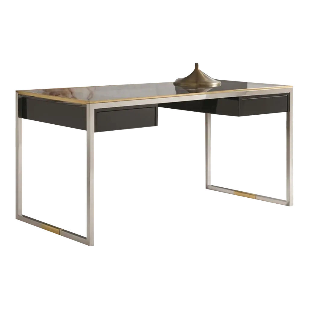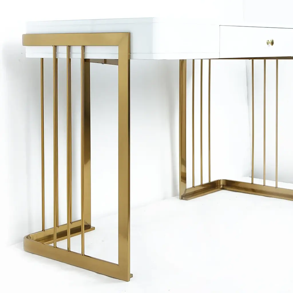This modern office desk is the ideal combination of style and functionality for your home or workplace. It has a gold base and either a black ash veneer or white lacquer top with a structured design. The writing desk, which has a single drawer for storage and gold hardware, will immediately become the focal point of any room. A gold accent and a sleek white or black lacquer surface combine nicely in a modern or luxury-themed space. Office supplies may be stored in the drawer's substantial storage area. It's built to last because of its robust MDF and stainless steel construction. You may use it for anything from a work desk to a dressing table to a console with storage, depending on what you want to use it for.