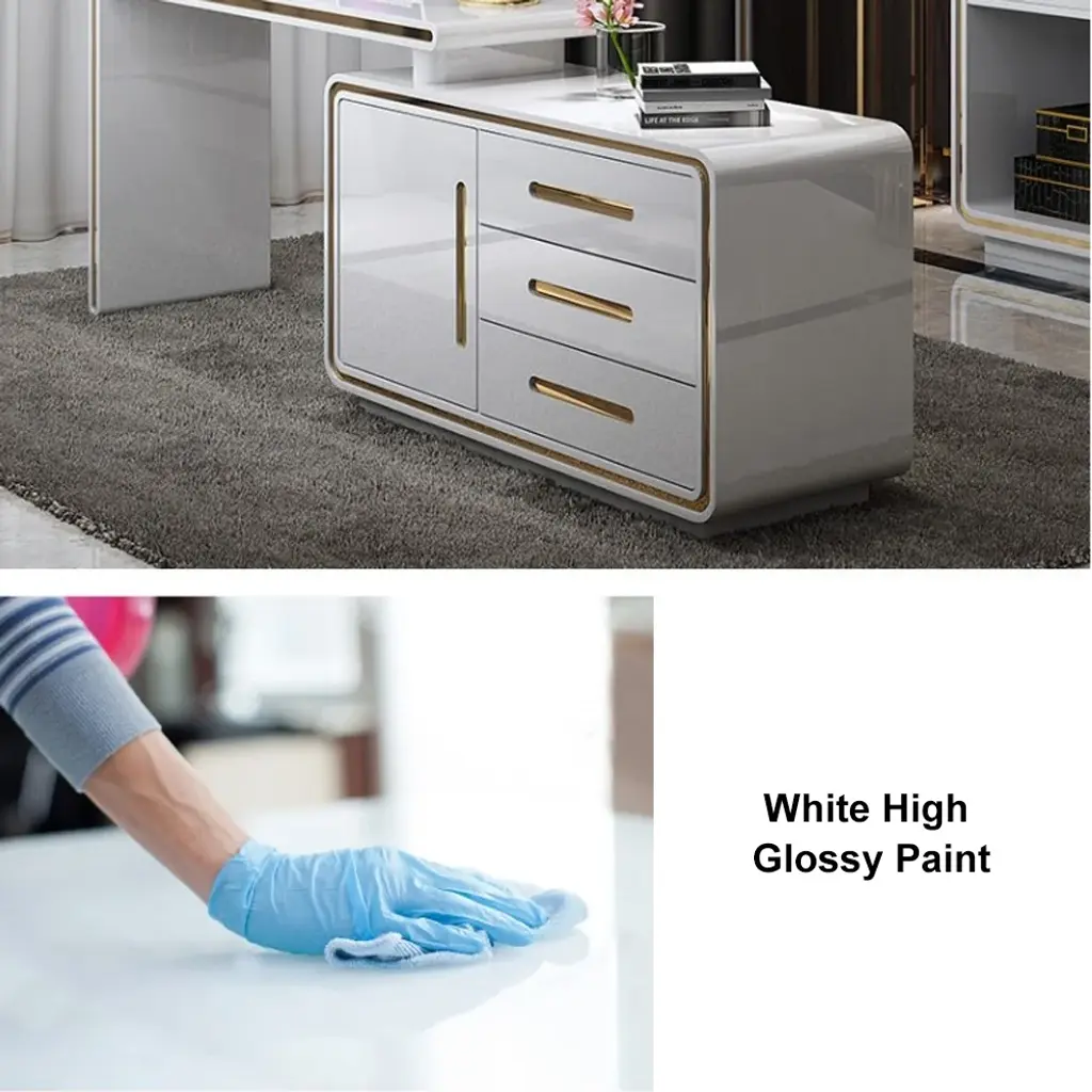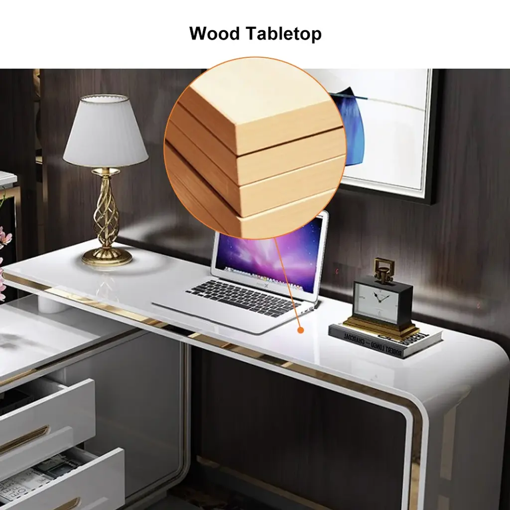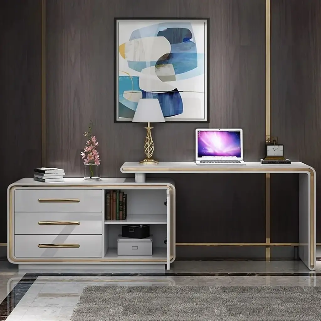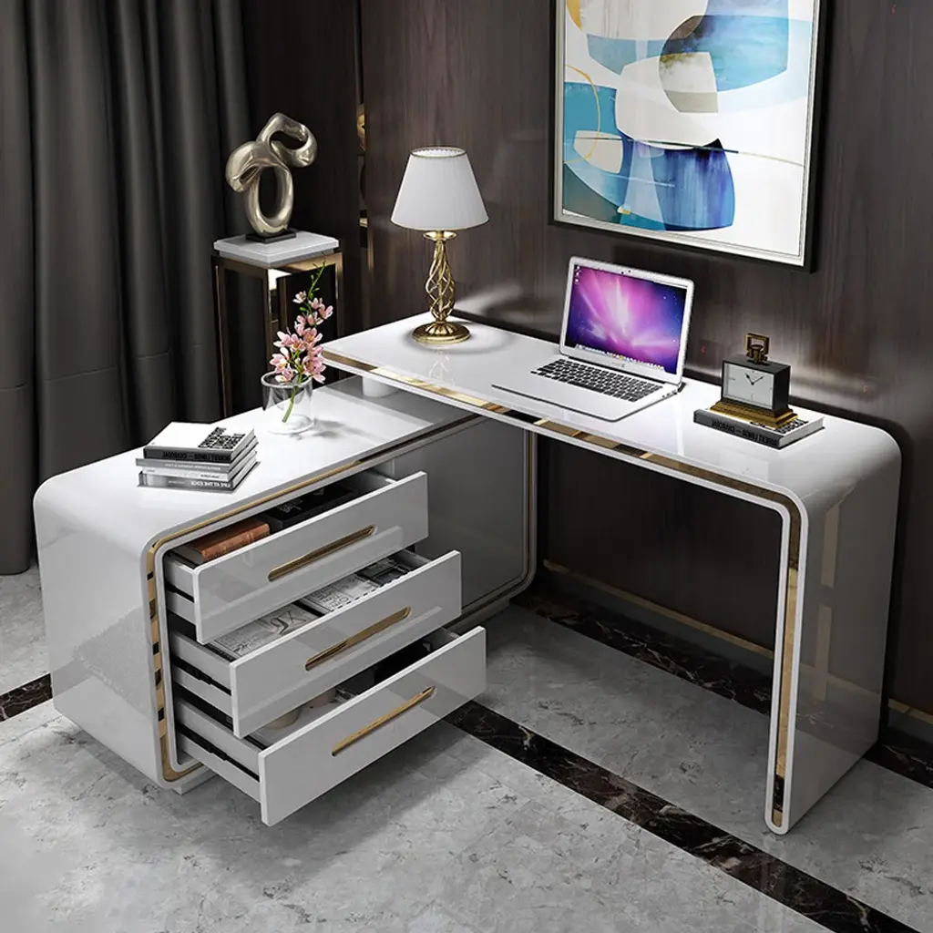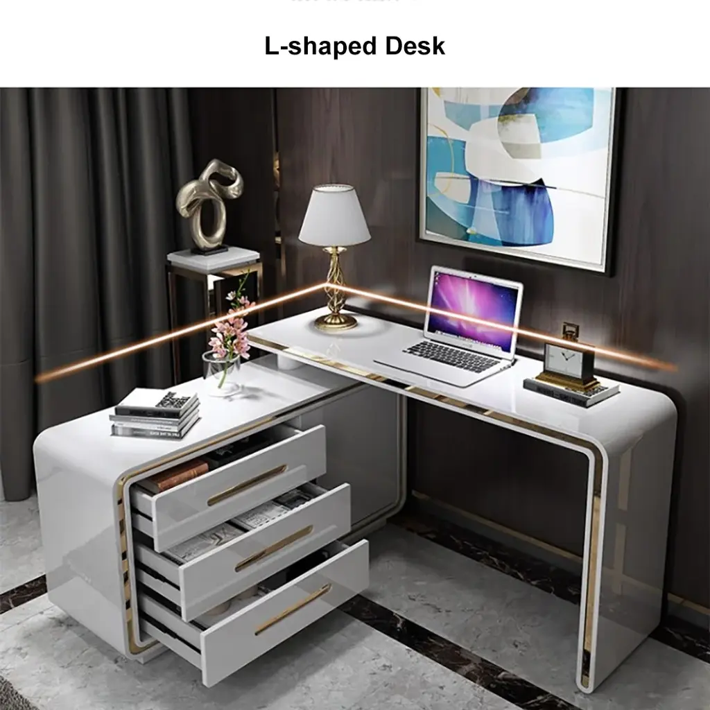 Maximize your workspace with this versatile L-shaped desk, featuring a 360° rotating design and abundant storage including 3 drawers and 2 shelves. The high-gloss white finish with gold accents creates a modern aesthetic, while the premium engineered wood and pine wood construction ensures lasting durability. Perfect for small offices or home workspaces, this desk keeps essentials organized while providing ample room for computers and work materials.