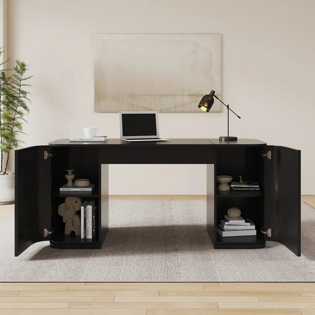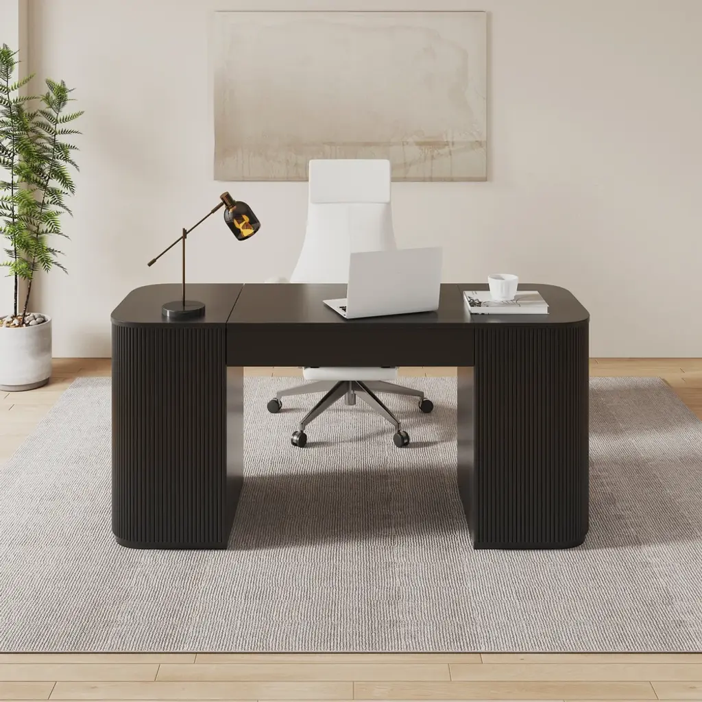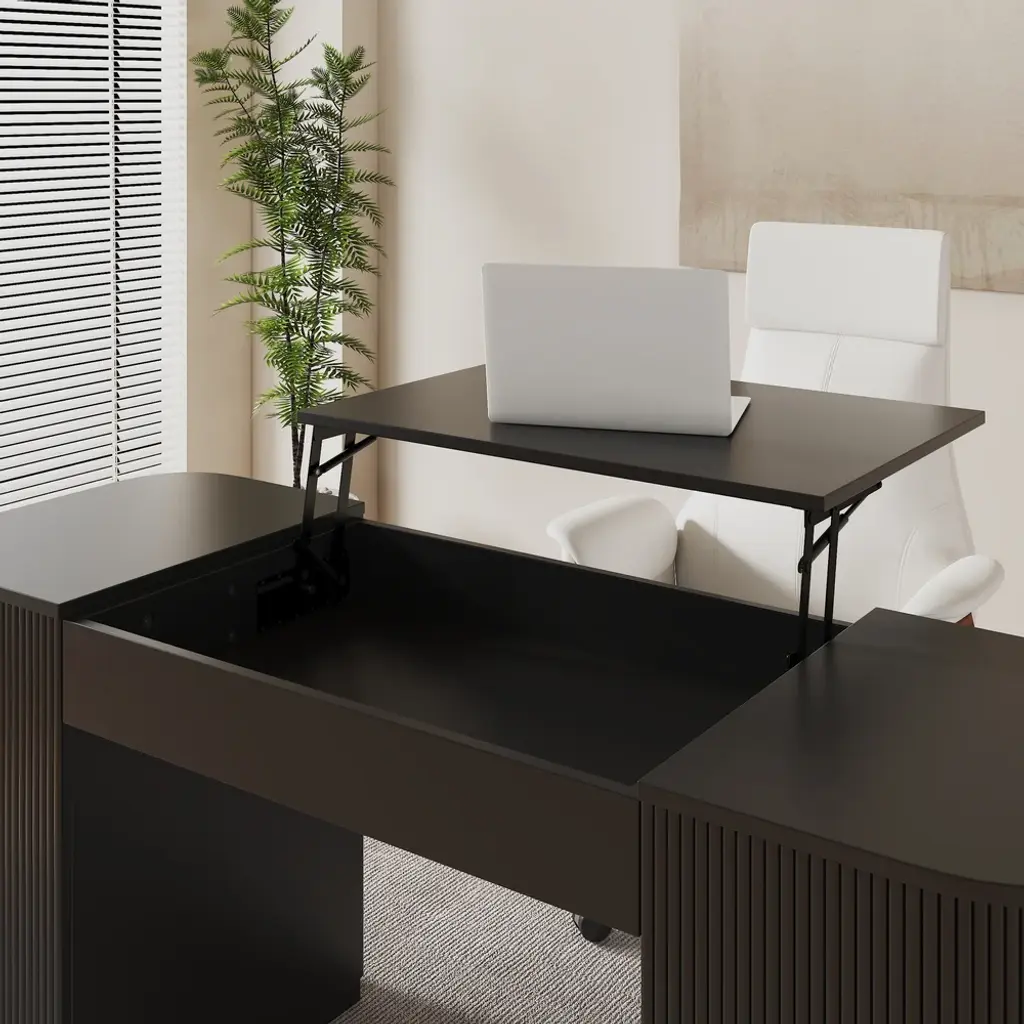 Revolutionize your workday with this 60" height-adjustable standing desk. Crafted from warp-resistant engineered wood, it transitions smoothly between sitting/standing positions. Features 2 doors + 4 cabinets for hidden storage, plus fluted panels for modern elegance. Perfect for ergonomic home offices.