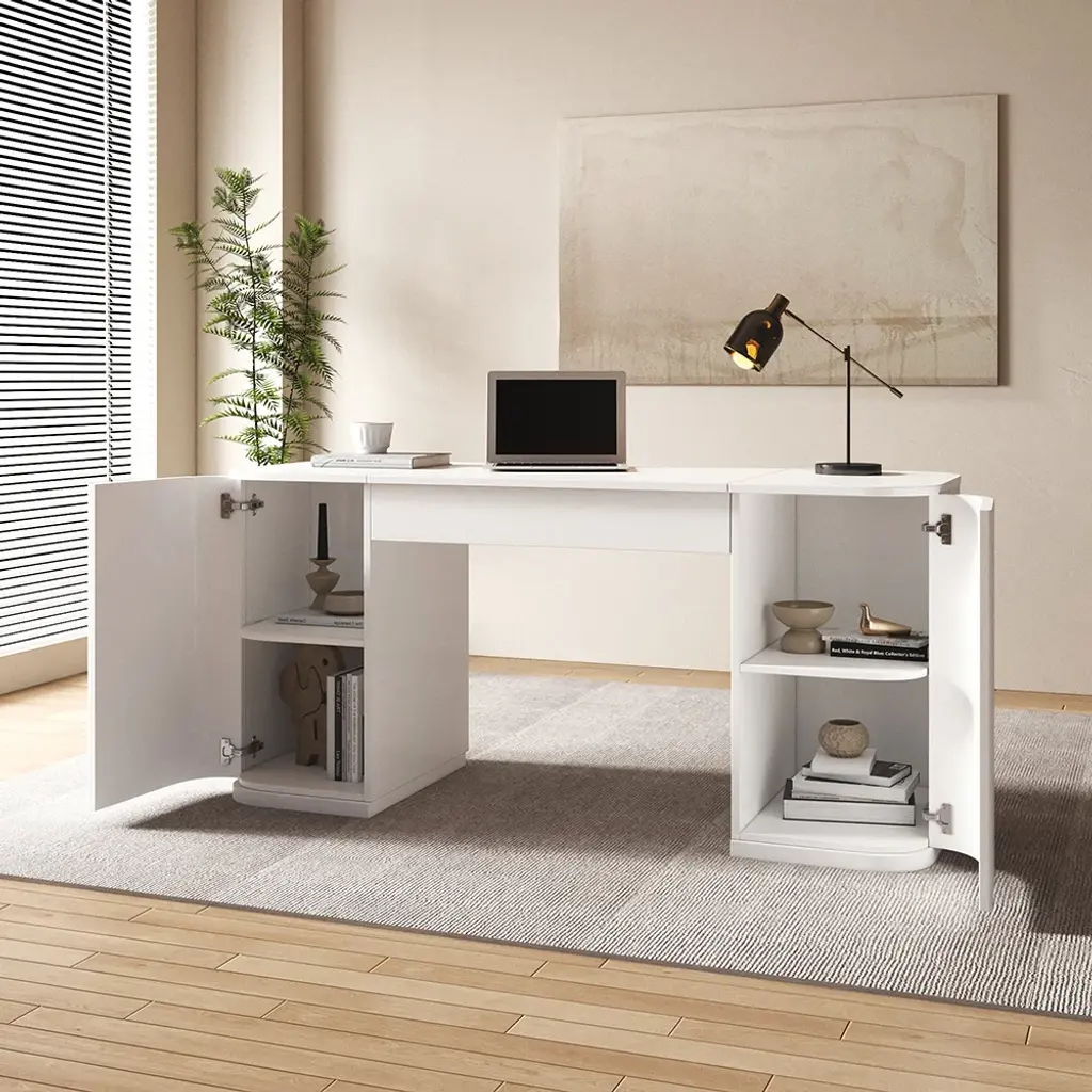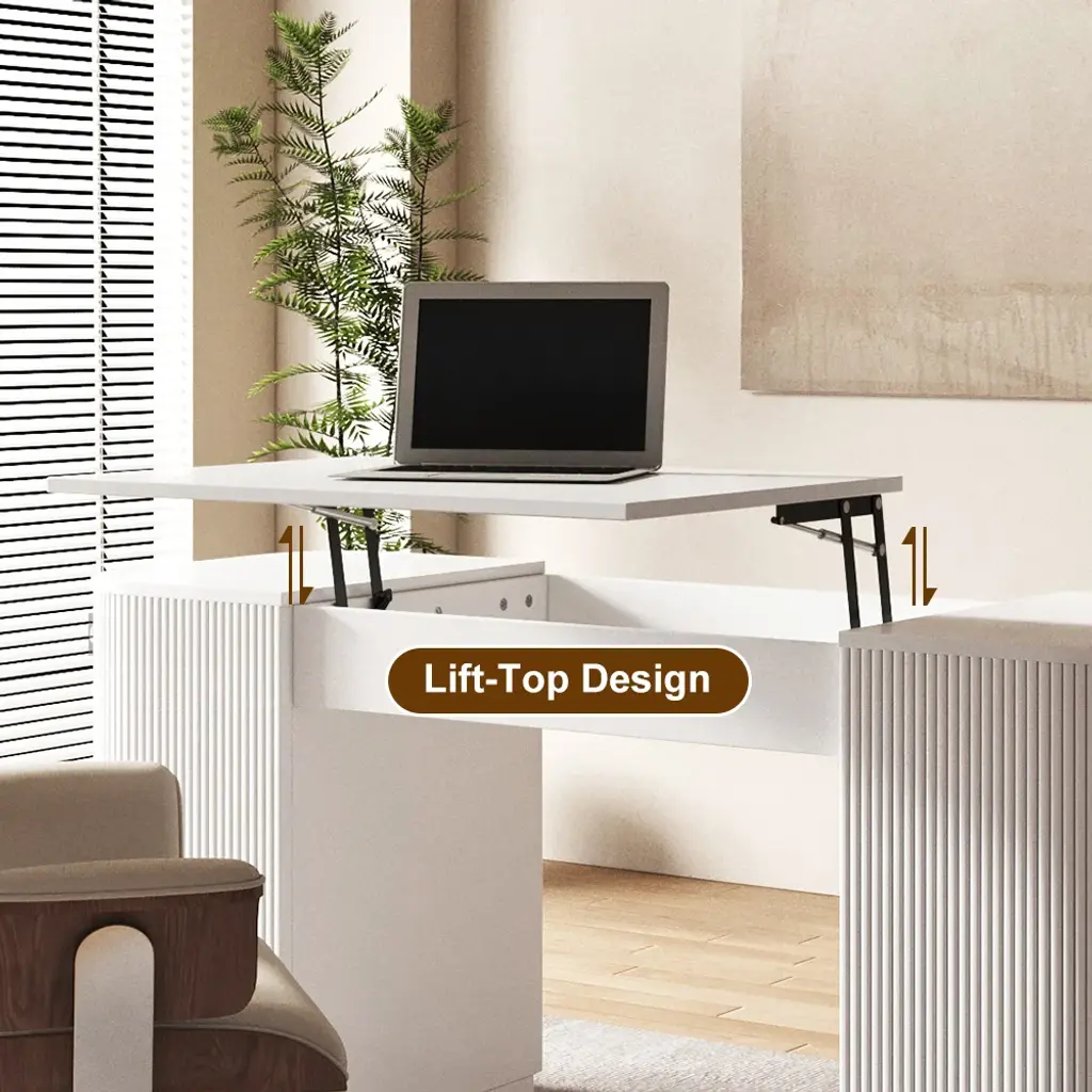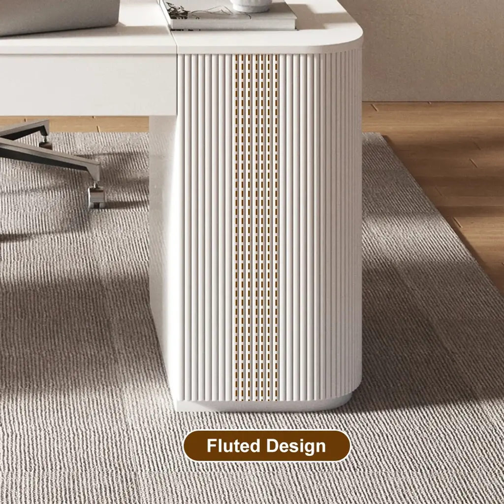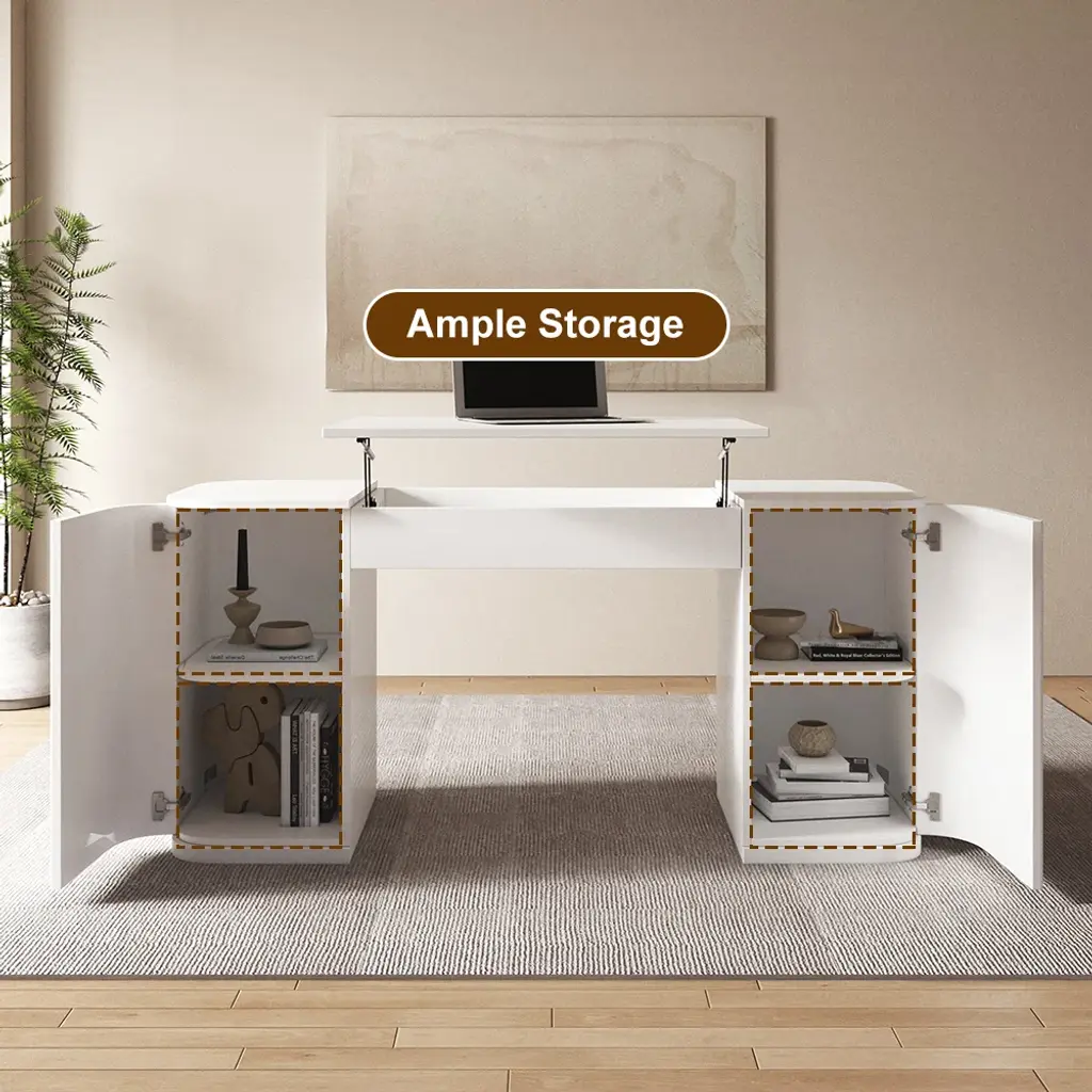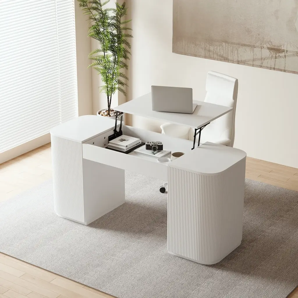 Transform your work routine with this 60" height-adjustable standing desk featuring smooth lift mechanism and ample storage. Crafted from warp-resistant engineered wood with elegant fluted details. Two cabinet doors conceal four shelves for office essentials. Fully assembled with pedestal base. Switch between sitting/standing positions effortlessly to reduce back pain. Modern white finish complements any decor.